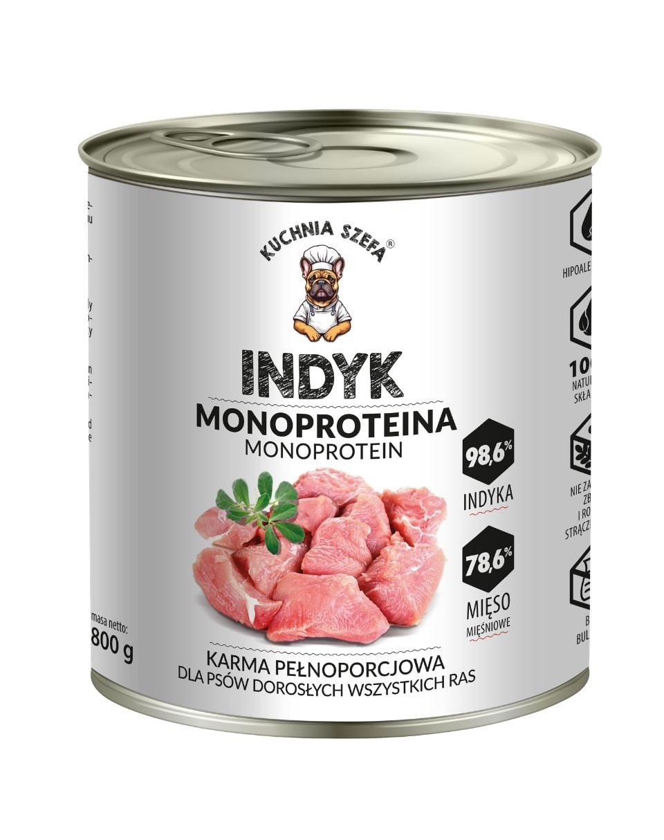 Hrană umedă monoproteică cu curcan pentru câini. KUCHNIA SZEFA Monoproteină Curcan este o hrană umedă completă pentru câini, formulată pe baza unei singure surse de proteină animală. Rețeta conține un procent foarte ridicat de curcan și este potrivită pentru câinii cu sensibilitate digestivă sau alergii alimentare.