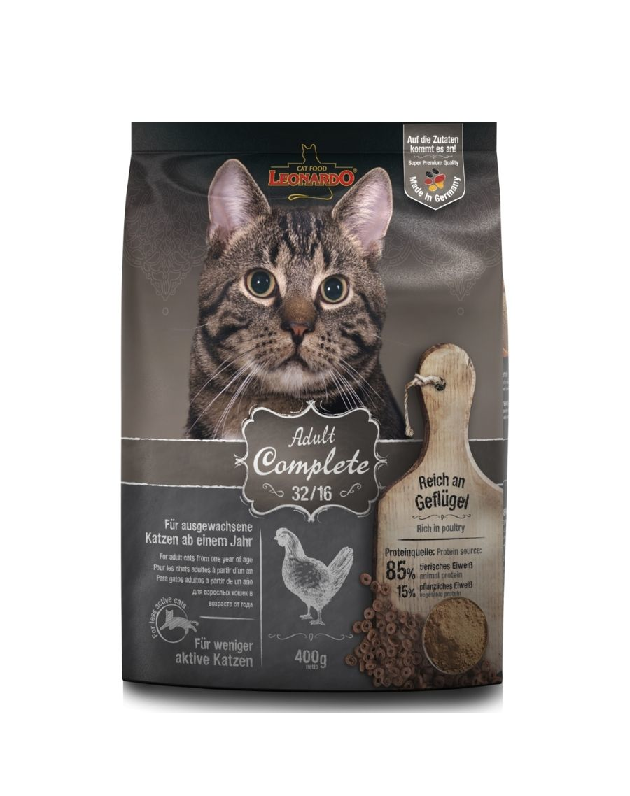 Leonardo Adult Complete 32/16 este un aliment uscat cu un conținut redus de energie pentru a menține o formă sănătoasă a corpului pisicii cu un nivel scăzut de activitate fizică. Conține 16% grăsimi, 32% proteine animale și o compoziție echilibrată de substanțe vitale. Semințele de in asigură corpului pisicii grăsimi omega-3, care, împreună cu lecitina, susțin menținerea unei piele sănătoasă și a unui strat strălucitor. Mâncarea are un gust ușor afumat și o aromă naturală de malț pe care o adoră pisicile.