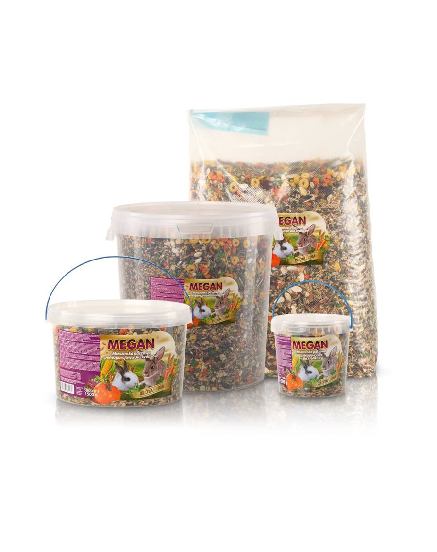 Hrana este foarte variată, contine mai mult de douăzeci de ingrediente. Amestecul contine putine grăsimi, special adaptat pentru iepuri. Conține ierburi, cereale, legume (unele special pregătite, care apar în mediul natural al acestor animale).