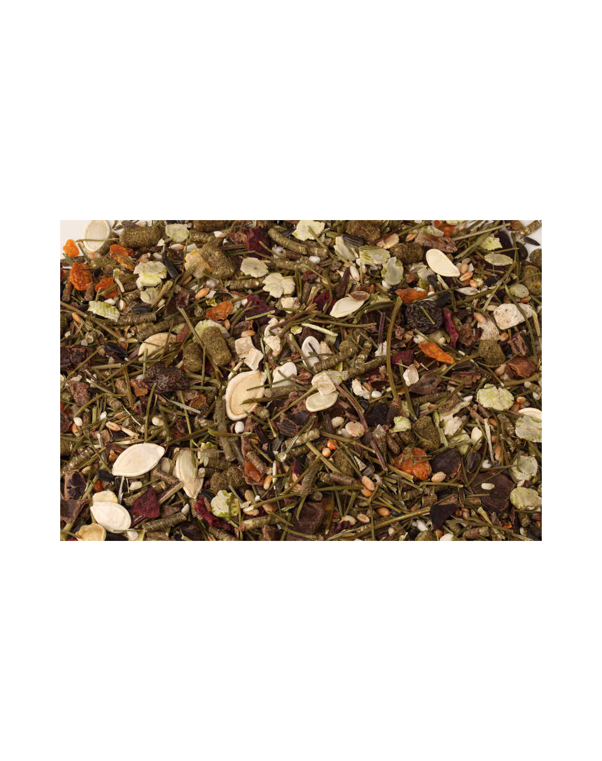 roșcove, semințe de floarea soarelui, morcovi uscați, sfeclă roșie uscată, stafide, porumb, mazăre, semințe de dovleac, orez preparat, cartofi uscați, ierburi.