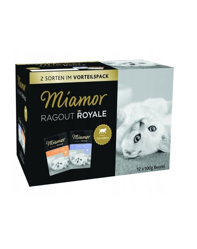 Setul conține 12 pliculețe de 100 g, dintre care 6 x carne de pasăre, 6 x carne de vită.