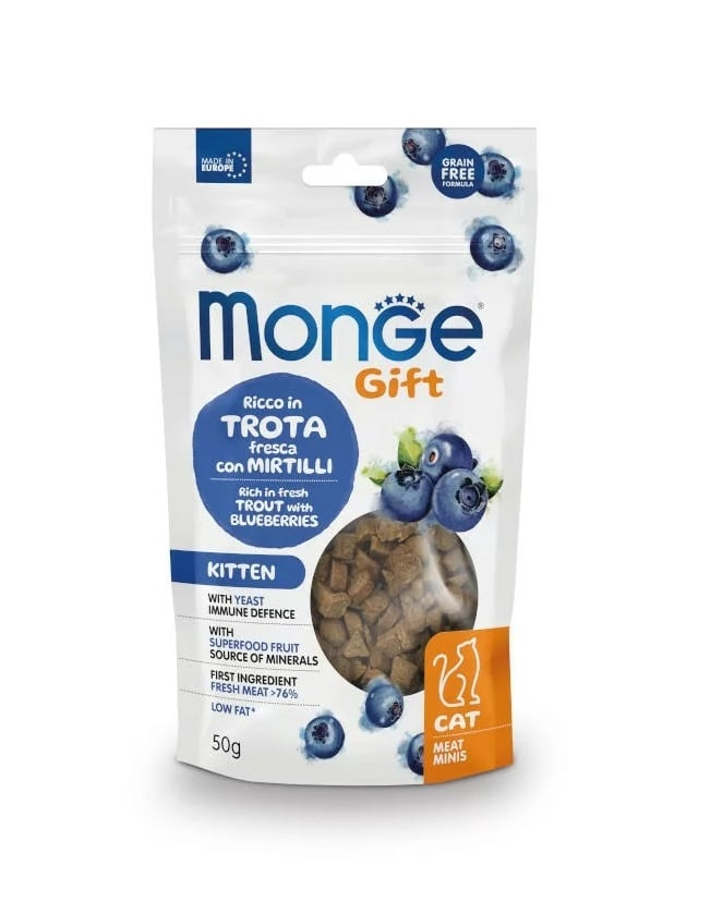 Hrană complementară fără cereale pentru pisoi în creștere. MONGE Kitten With Yeast Immune Defense cu păstrăv și afine este o hrană complementară destinată pisoiilor aflați în perioada de creștere. Rețeta este fără cereale și se bazează pe un conținut ridicat de pește, fiind concepută pentru a completa dieta zilnică a puilor de pisică.