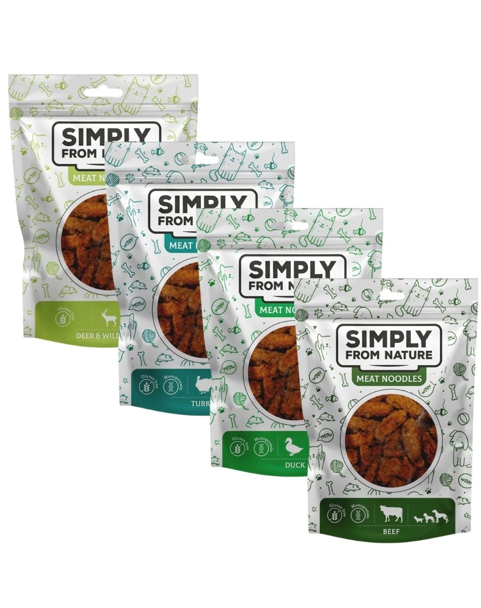 Simply from Nature Meat Noodles este o hrană complementară pentru câini. Se dă ca gustare, între mese. Se recomandă să nu vă supraalimentați câinele.