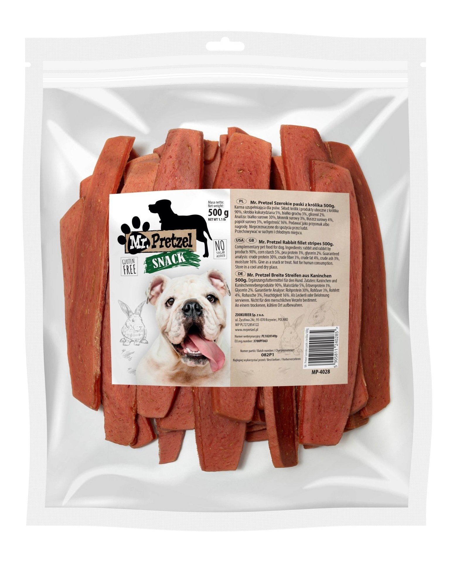 PREMIUM – Mr. Pretzel Fâșii late din carne de iepure sunt recompense din carne de cea mai înaltă calitate, extrem de gustoase, destinate prietenului tău patruped.