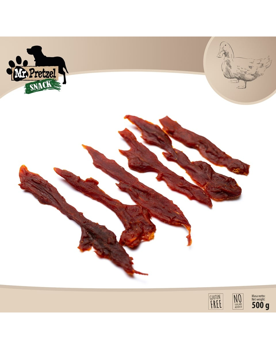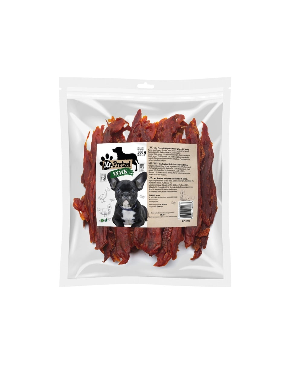 Mr. Pretzel Fileuri moi din rață – gustare delicioasă pentru câini de toate rasele și vârstele. Fileurile moi din rață de la Mr. Pretzel sunt o gustare naturală de calitate superioară, create pentru a răsfăța câinii și a le oferi o sursă sănătoasă de energie. Conțin 92% carne de rață, bogată în proteine ușor digerabile, care susțin masa musculară și vitalitatea zilnică a câinelui.