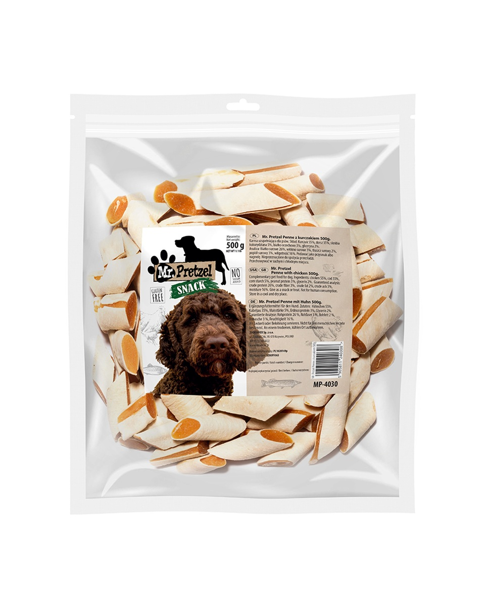 PREMIUM – Mr. Pretzel Penne cu pui sunt recompense din carne de cea mai înaltă calitate, extrem de gustoase, destinate prietenului tău patruped.