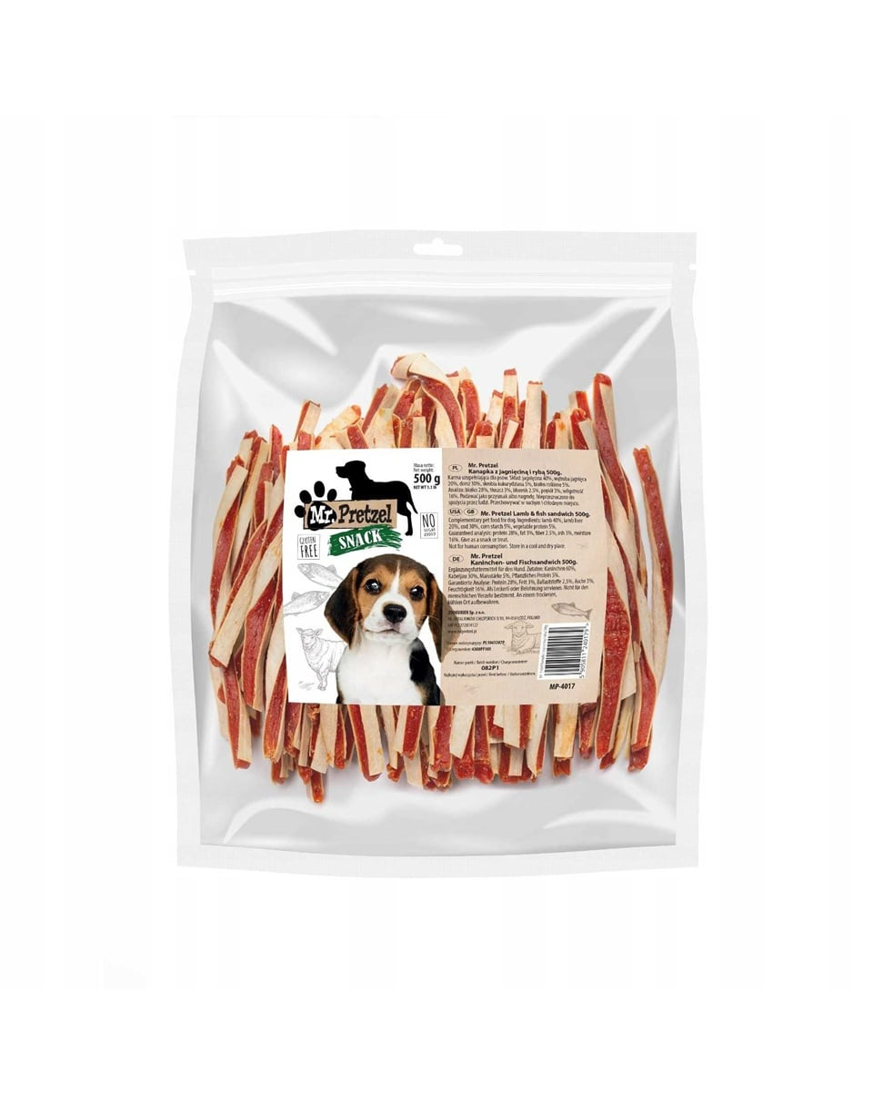 Sandwich-urile cu miel și pește marca Mr. Pretzel sunt o gustare naturală, delicioasă și hrănitoare, potrivită pentru câinii de toate rasele.