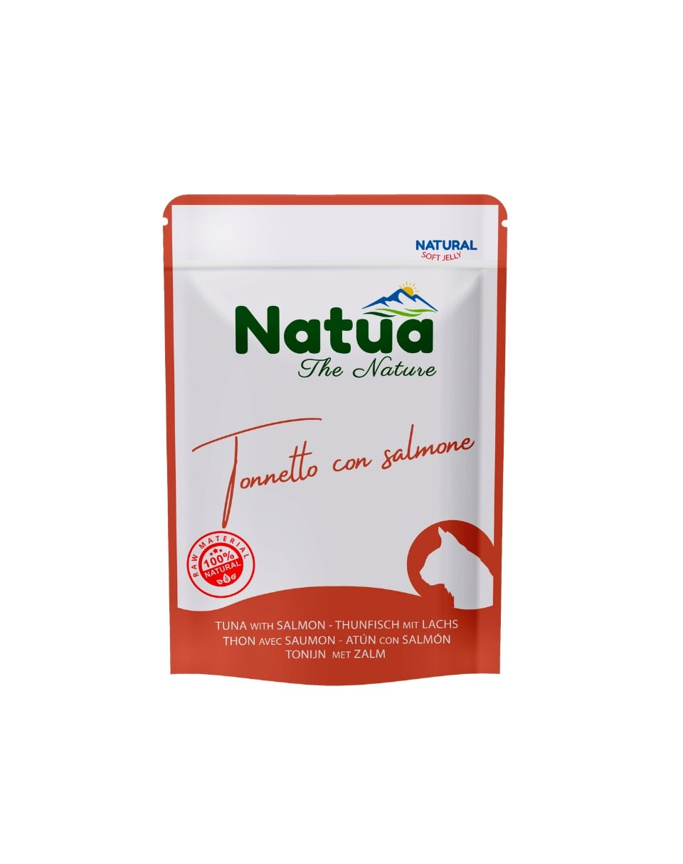 NATUA Natural Ton cu somon în aspic este o hrană umedă complementară destinată pisicilor adulte, creată ca o gustare delicioasă ce îmbogățește dieta zilnică. Rețeta se bazează pe 55% ton și 4% somon, oferind o sursă valoroasă de proteine și o aromă naturală de pește, potrivită chiar și pentru pisicile mai selective.
