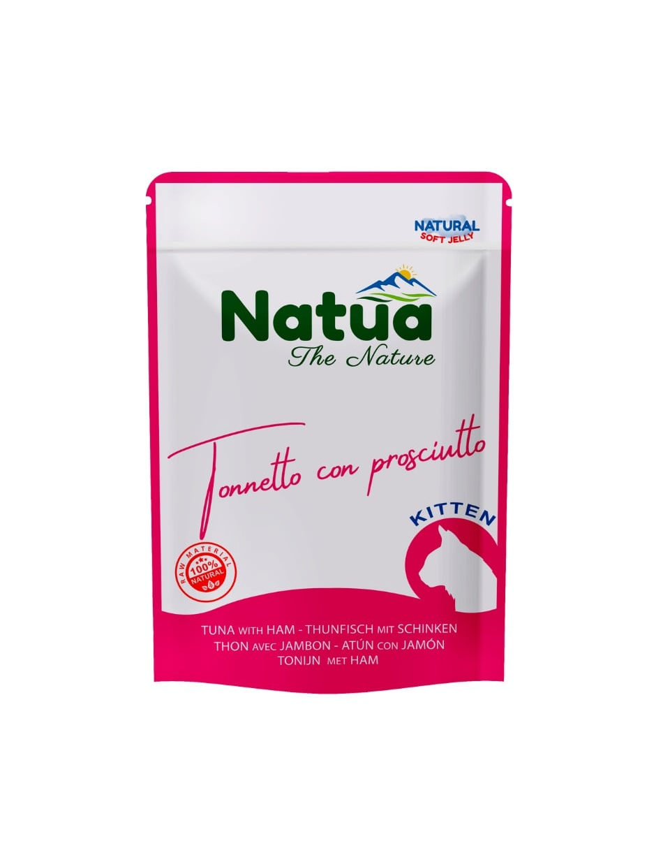 NATUA Natural Ton cu șuncă în aspic este o hrană umedă complementară, creată special pentru puii de pisică până la vârsta de 1 an. Rețeta are la bază ton de înaltă calitate (55%) combinat cu 4% șuncă, oferind o sursă valoroasă de proteine și un gust deosebit de atrăgător pentru pisoi.