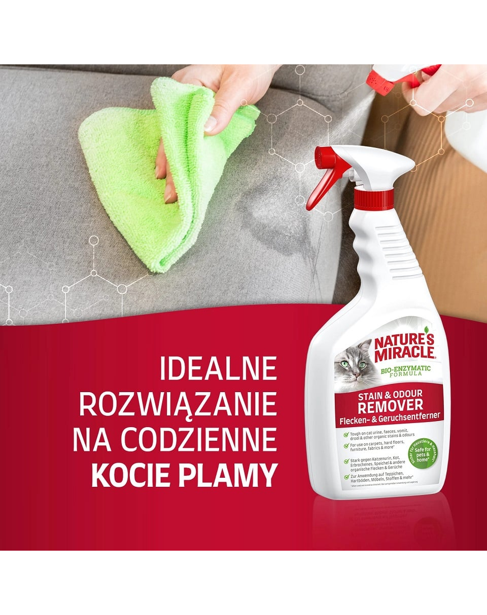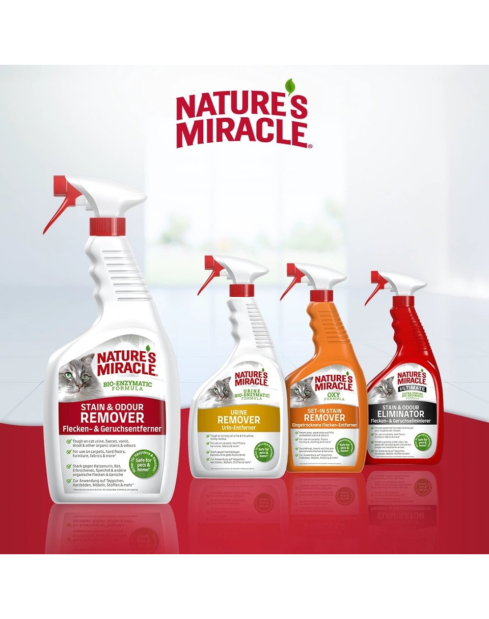 Nature's Miracle® Stain & Odour Remover este conceput pentru a îndepărta cu ușurință petele de pisică de zi cu zi. Formula bio-enzimatică, pe bază de bacterii, produce enzime care elimină petele organice și acționează până când petele și neplăcerile