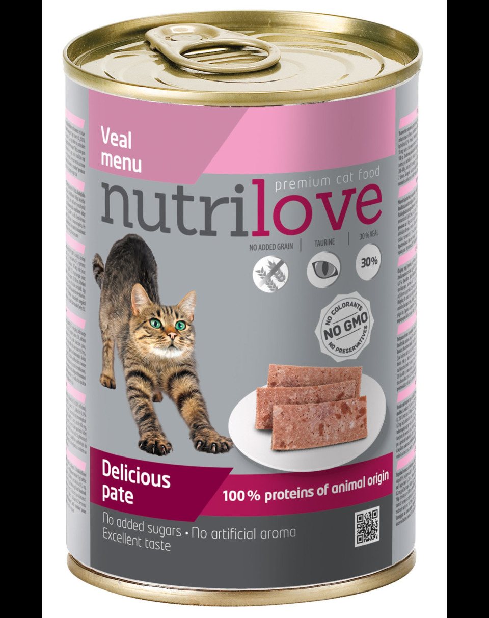 Nutrilove - o mâncare de vițel este un aliment complet de înaltă calitate pentru pisici care conține proteine de origine animală - fără adăugarea de cereale. Pisica ta va aprecia gustul delicios al unui pateu bogat în vițel (30%) fără adaos de zahăr sau arome artificiale. Tot ce are nevoie pisica ta. Conținut ridicat de carne - până la 60% din carne și produse de origine animală.