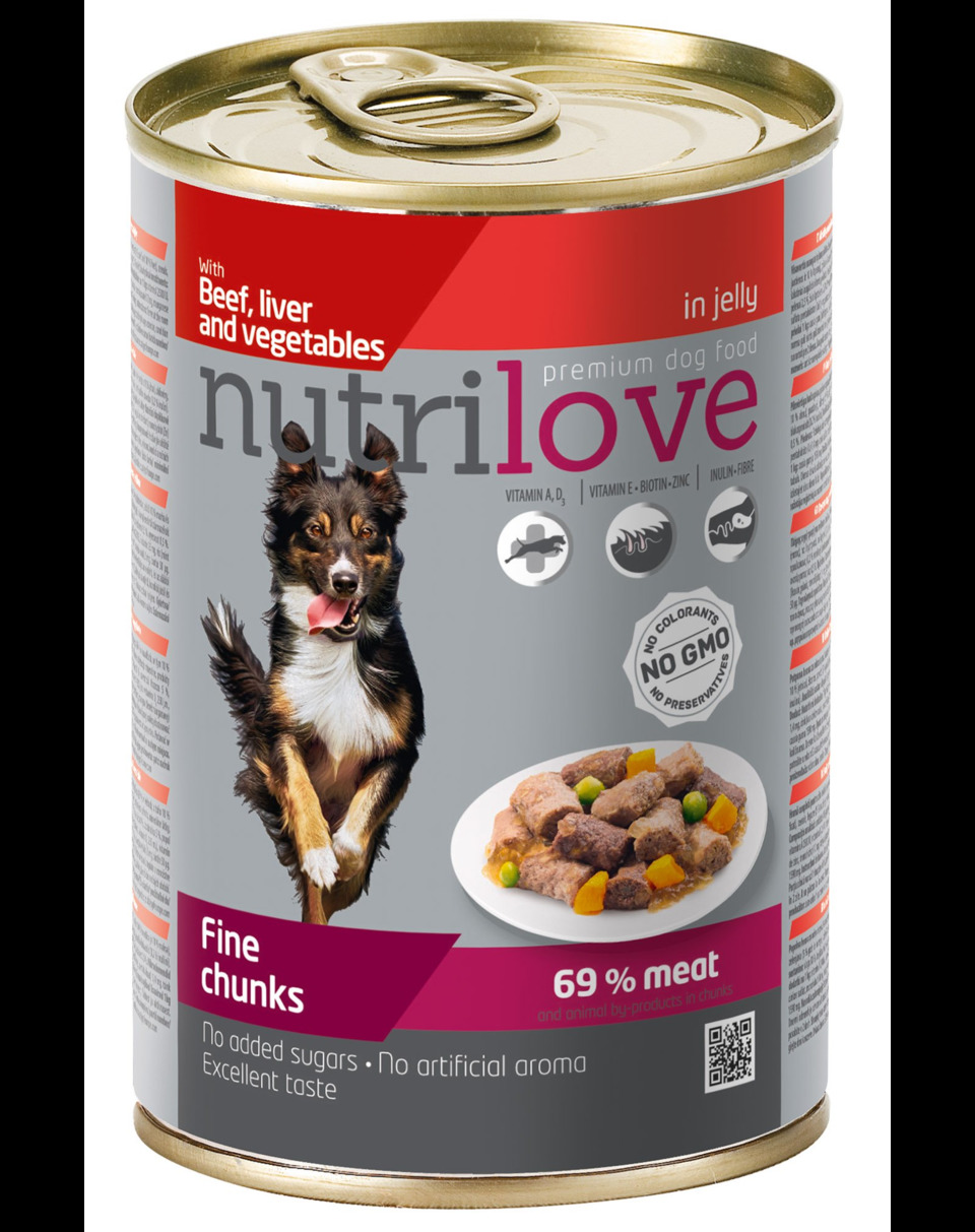 Nutrilove - bucăți gustoase de carne cu carne de vită, ficat și legume în jeleu delicios este un aliment complet pentru câinii adulți. Câinele dvs. va aprecia gustul excelent fără a adăuga zahăr, arome artificiale sau conservanți. Tot ce are nevoie câinele tău.