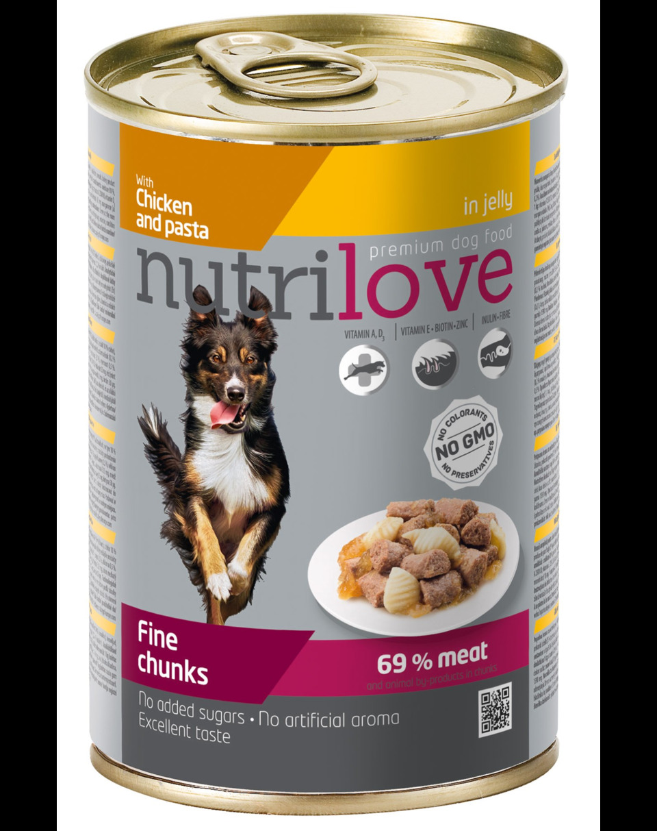 Nutrilove - bucăți gustoase de carne cu pui și paste în jeleu delicios este un aliment complet pentru câinii adulți. Câinele dvs. va aprecia gustul excelent fără a adăuga zahăr, arome artificiale sau conservanți. Tot ce are nevoie câinele tău.