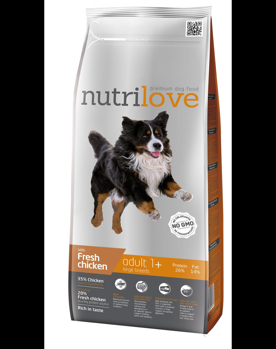 Nutrilove Adult Large - (pui proaspăt 20%, păsări de curte uscate (15% pui), păsări totale 40%) este o hrană pentru câini adulți de înaltă calitate special dezvoltată pentru rasele mari. Cu pui proaspăt ca sursă cheie de proteine. Gust minunat fără adăugarea de arome artificiale. Fără adăugarea de conservanți și coloranți. Tot ce are nevoie câinele tău.