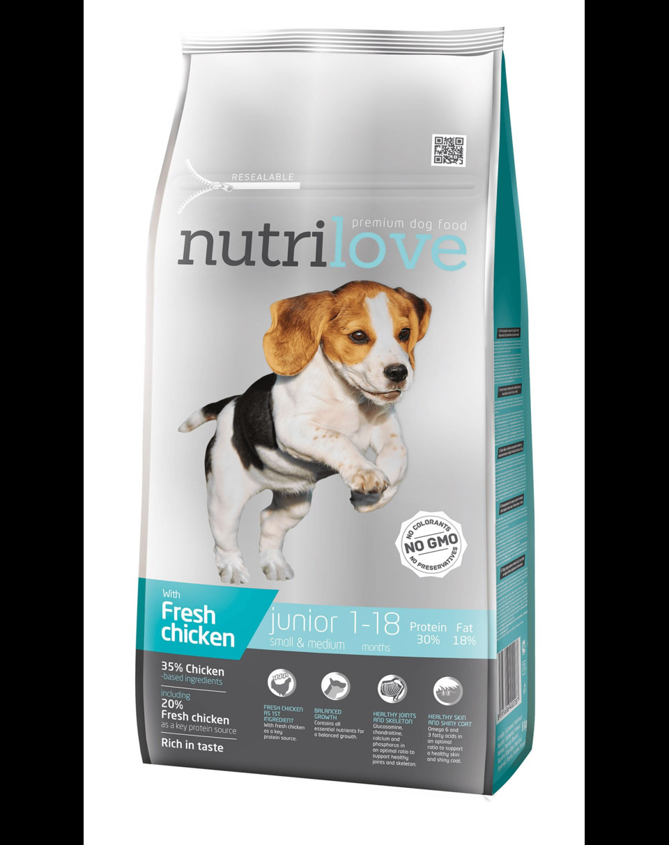 Nutrilove Junior Small & Medium - (pui proaspăt 20%, păsări uscate (inclusiv 15% pui), păsări totale 40%) este un aliment de înaltă calitate dezvoltat pentru pui și câini tineri de rase mici și mijlocii cu vârsta cuprinsă între 4 săptămâni și 18 luni. Conține glucozamină, condroitină, calciu și fosfor pentru oase și articulații sănătoase. Gust excelent fără adăugarea de arome artificiale, cu pui proaspăt. Fără adăugarea de conservanți și coloranți. Tot ce are nevoie câinele tău.