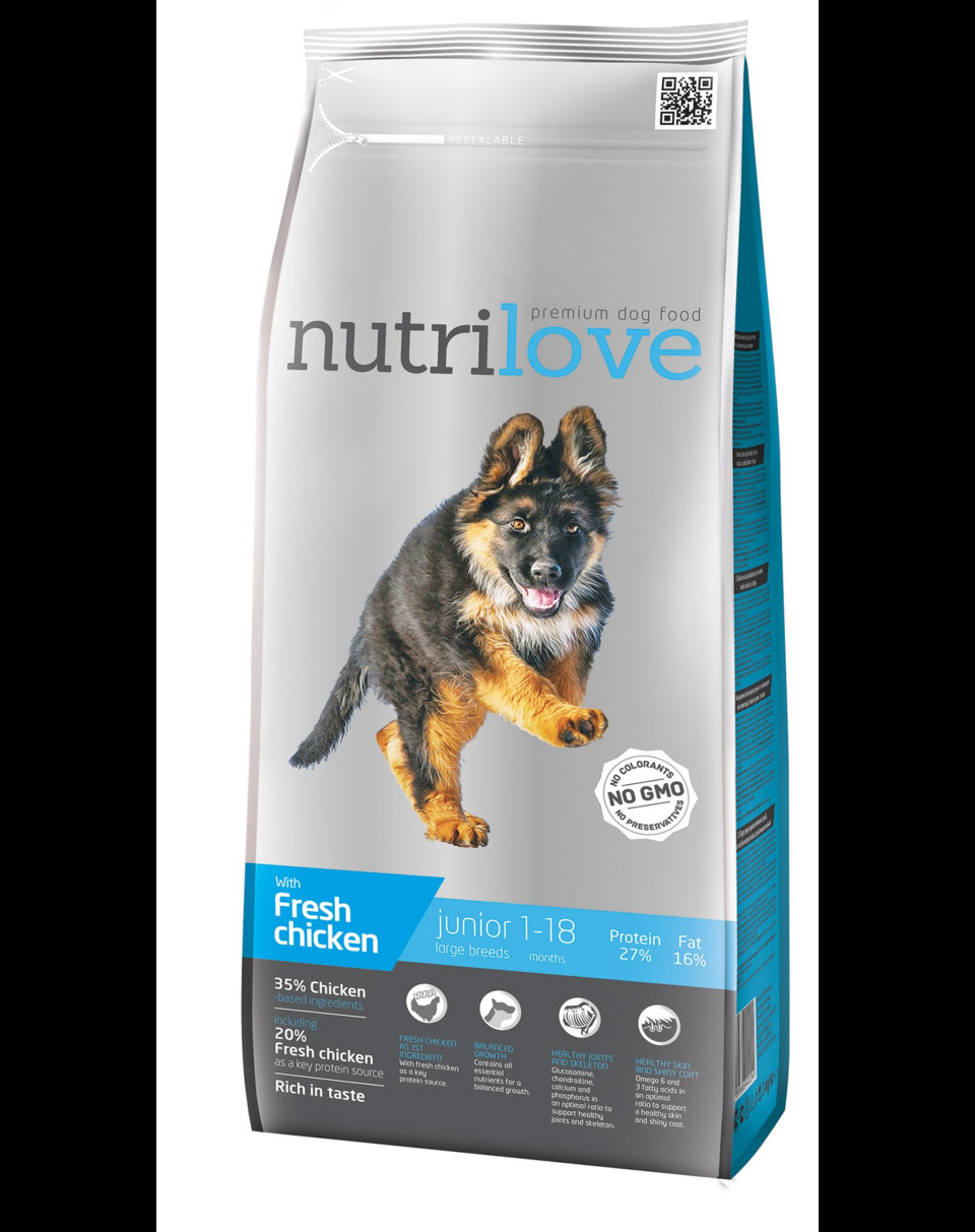 Nutrilove Junior Large - (pui proaspăt 20%, păsări de curte uscate (15% pui), păsări totale 40%) este un aliment de înaltă calitate dezvoltat pentru pui și câini tineri de rase mari de la 4 săptămâni la 18 luni. Conține glucozamină, condroitină, calciu și fosfor pentru oase și articulații sănătoase. Gust excelent fără adăugarea de arome artificiale, cu pui proaspăt. Fără adăugarea de conservanți și coloranți. Tot ce are nevoie câinele tău.