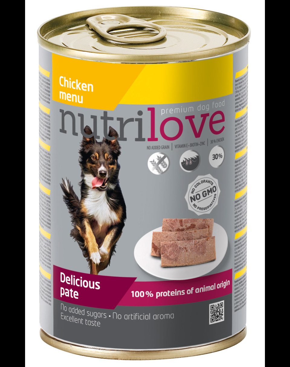 Mâncare completă, fără cereale, pentru câinii adulți sub formă de pate.
