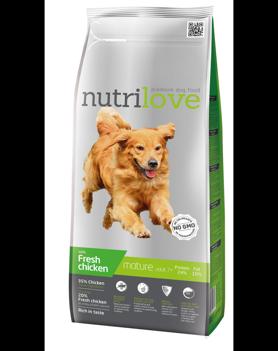 Nutrilove Mature - (Pui proaspăt 20%, Păsări uscate (15% Pui), Păsări totale 40%) este un aliment de înaltă calitate pentru câinii adulții cu vârsta peste 7 ani. Reducerea grăsimilor și a caloriilor pentru a vă menține câinele într-o stare optimă. Gust excelent fără adăugarea de arome artificiale, cu pui proaspăt. Fără adăugarea de conservanți și coloranți. Tot ce are nevoie câinele tău.