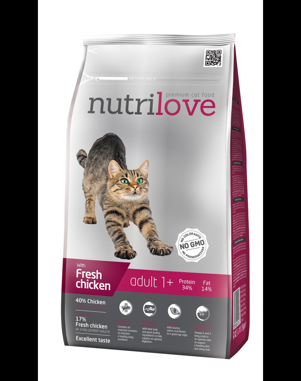 Nutrilove Adult - (pui proaspăt 17%, păsări uscate (23% pui), păsări totale 40%) este un aliment de înaltă calitate pentru pisicile adulte de toate rasele. Conține acizi grași Omega 6 și Omega 3 pentru o piele sănătoasă și un strat strălucitor.