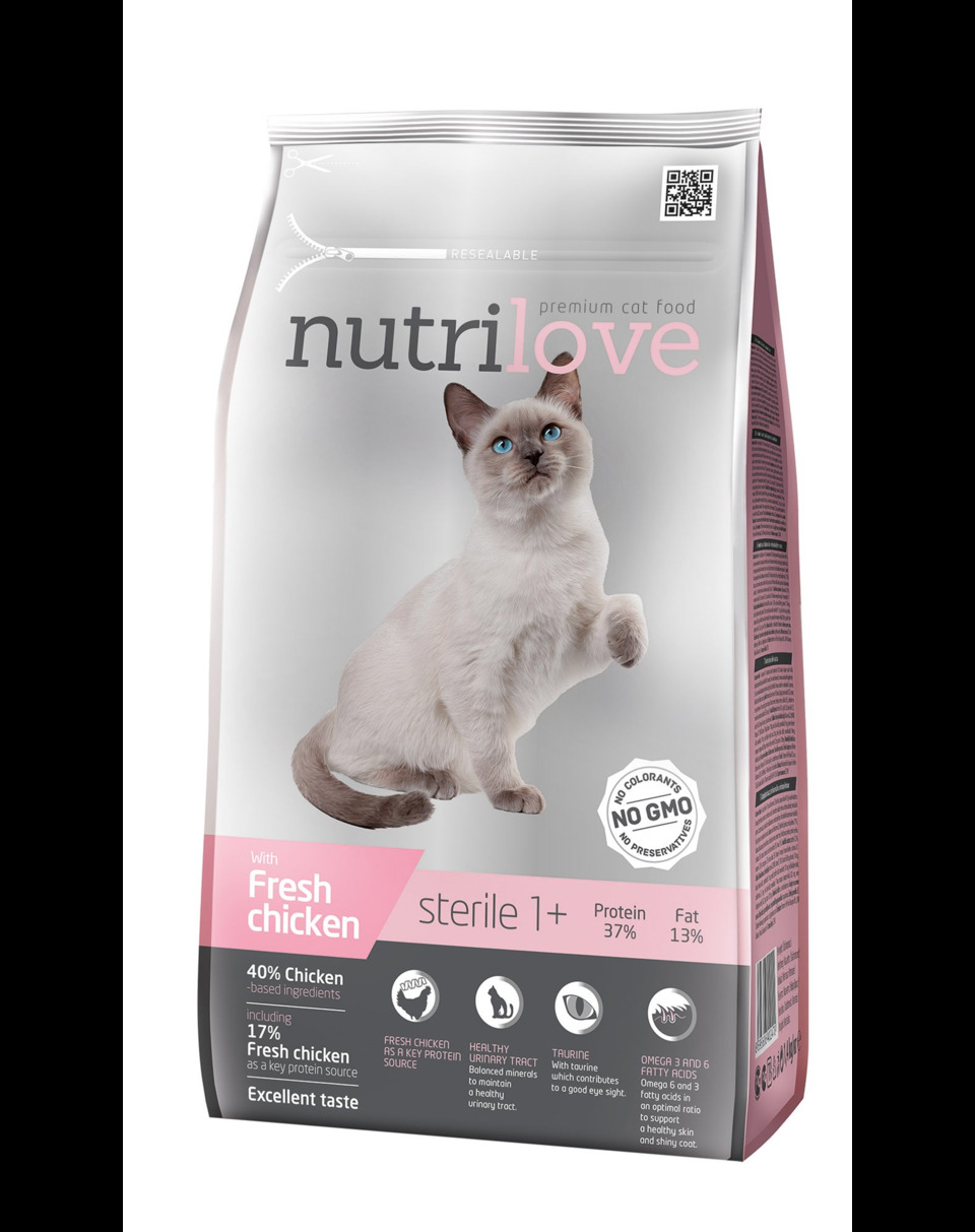 Nutrilove Sterile - (pui proaspăt 17%, păsări de curte uscate (23% pui), pui total 40%) este un aliment de înaltă calitate special conceput pentru pisici după sterilizare. Proporții echilibrate de minerale pentru un sistem urinar sănătos. Gust excelent fără adăugarea de arome artificiale, cu pui proaspăt. Fără adăugarea de conservanți și coloranți.