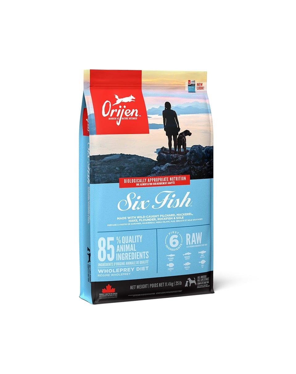 ORIJEN SIX FISH are un conținut inegalabil de pește prins în apele cristaline din Pacificul de Nord. Sunt livrate întregi, proaspete și pline de valoare nutritivă. ORIJEN este pregătit cu mândrie în bucătăriile NorthStar® pentru a vă menține câinele sănătos, puternic și fericit.