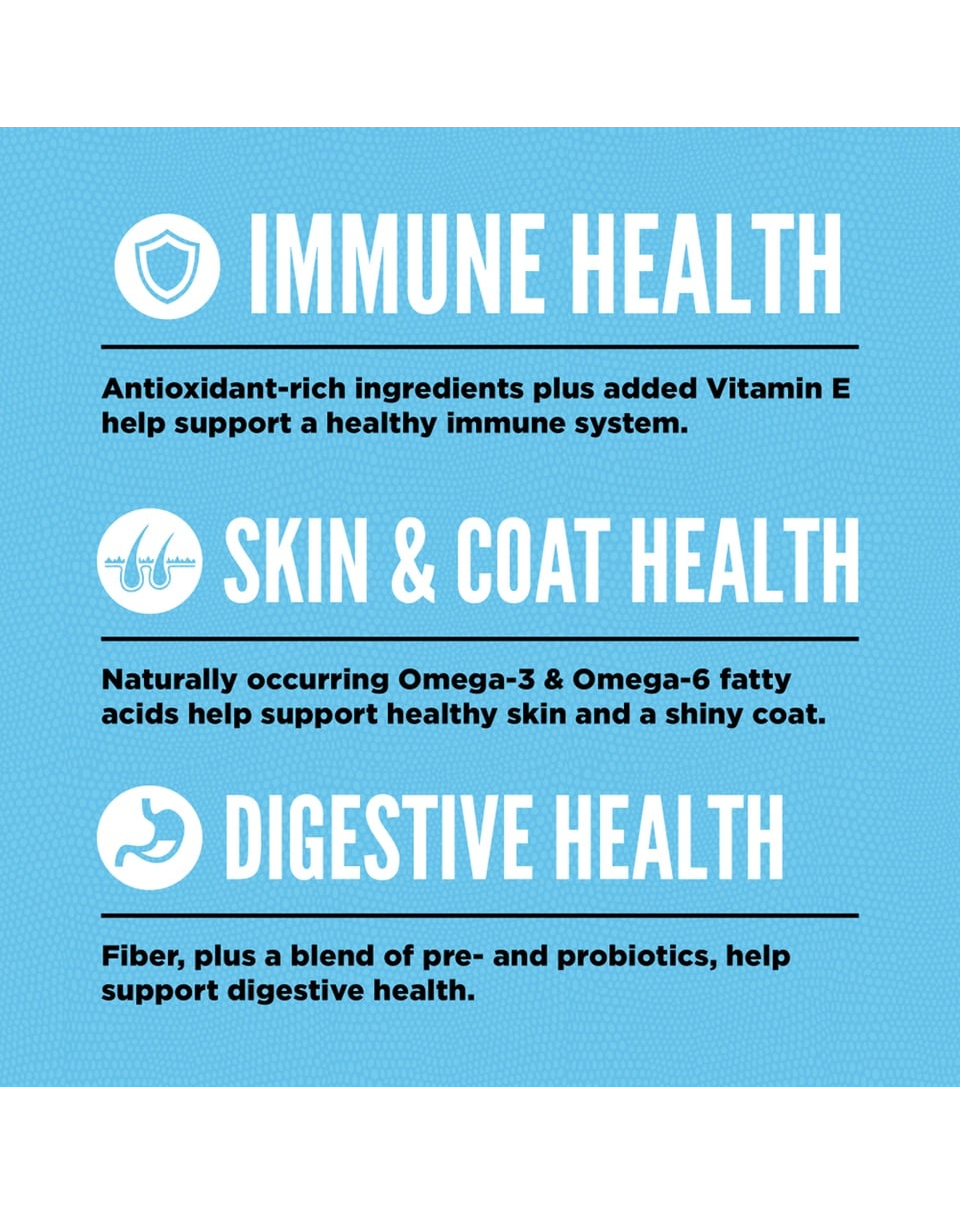Anșoa întreagă crudă (18%), macrou întreg crud (11%), merluciu întreg crud (10%), cambulă crudă (6%), pește de stâncă întreg crud (6%), limbă de mare întreagă crudă (6%), macrou deshidratat (5%), hering deshidratat (5%), pește alb deshidratat (5%), sardină deshidratată (5%), merlan albastru deshidratat (4%), ulei de hering (4%), linte roșie integrală, mazăre integrală, năut integral, linte verde integrală, fibre de linte, fasole pinto integrală, amidon de mazăre, ulei de floarea-soarelui, alge marine uscate, dovleac întreg proaspăt, dovleac întreg proaspăt, dovleac întreg proaspăt, dovleac întreg proaspăt, morcovi întregi proaspeți, mere întregi proaspete, pere întregi proaspete, rădăcină de cicoare uscată, varză kale proaspătă, spanac proaspăt, sfeclă roșie proaspătă, frunze de napi proaspete, afine întregi, afine întregi, fructe de saskatoon întregi, turmeric, ciulin de lapte, rădăcină de brusture, lavandă, holly, măceșe.