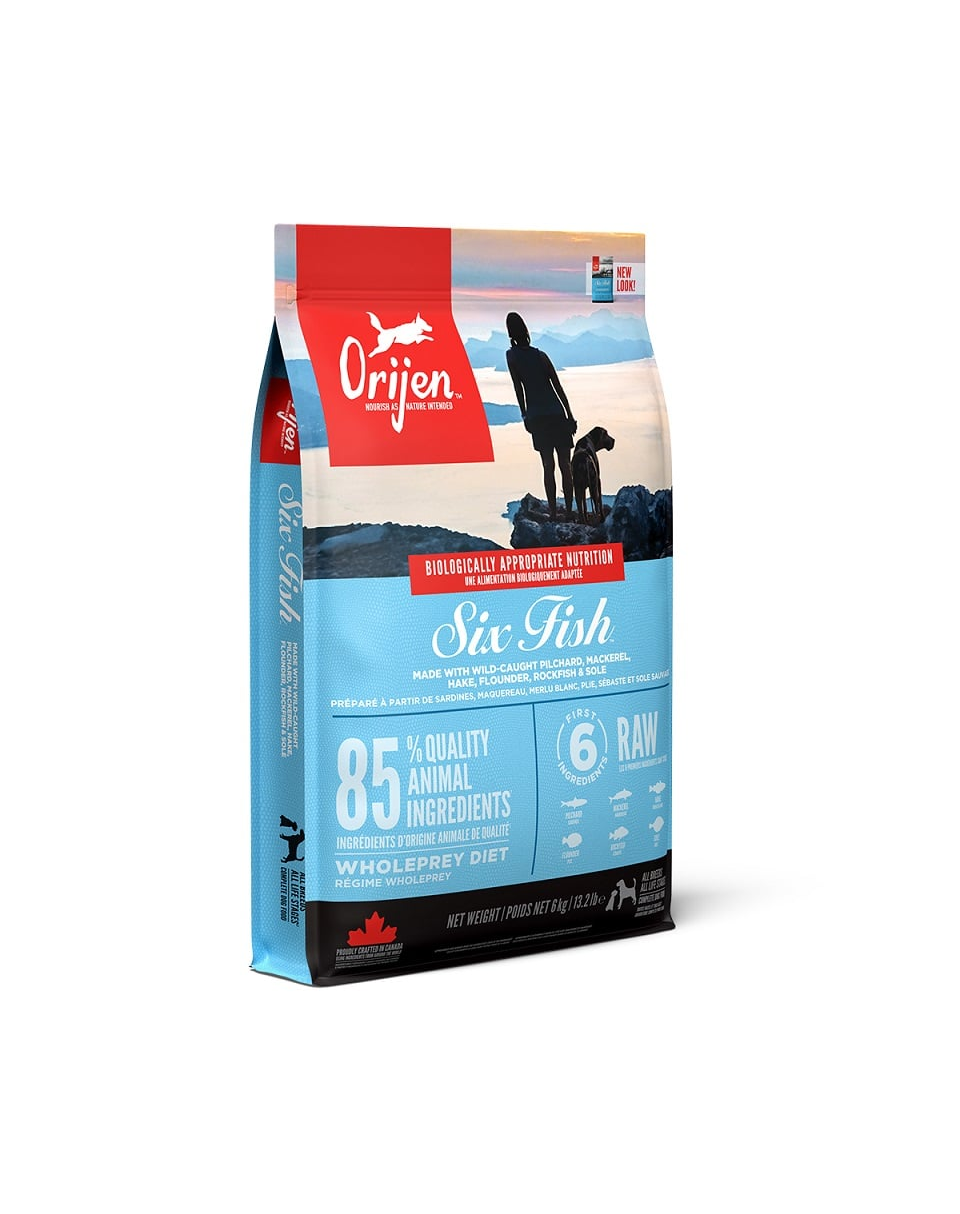 ORIJEN SIX FISH are un conținut inegalabil de pește prins în apele cristaline din Pacificul de Nord. Sunt livrate întregi, proaspete și pline de valoare nutritivă. ORIJEN este pregătit cu mândrie în bucătăriile NorthStar® pentru a vă menține câinele sănătos, puternic și fericit.