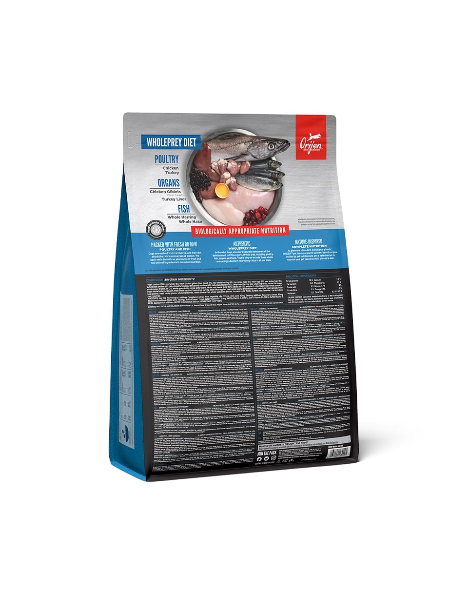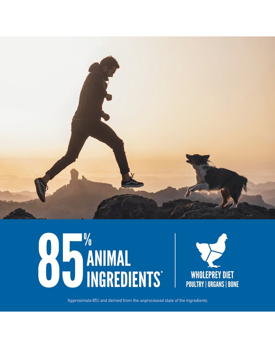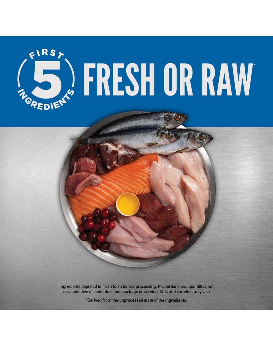 Pui proaspăt (25%), curcan crud (8%), măruntaie proaspete de pui (ficat, inimă) (7%), hering crud întreg (6%), merluciu crud întreg (5%), ouă proaspete (5%), ficat crud de curcan (5%), pui deshidratat (4%), curcan deshidratat (4%), macrou deshidratat (4%), sardine deshidratate (4%), hering deshidratat (4%), linte roșie întreagă, năut întreg, mazăre întreagă, mazăre întreagă, grăsime de pui (3%), linte verde întreagă, fasole pinto întreagă, fasole navy întreagă, fibre de linte, ulei de pollock (1%), amidon de mazăre, alge marine deshidratate, dovleac întreg proaspăt, mușchi întreg proaspăt, dovlecel întreg proaspăt, dovlecel întreg proaspăt, morcov întreg proaspăt, măr întreg proaspăt, pară întreagă proaspătă, rădăcină de cicoare deshidratată, varză kale proaspătă, spanac proaspăt, sfeclă roșie proaspătă, frunze de napi proaspete, afine întregi, afine întregi, fructe de saskatoon întregi, turmeric, ciulin de lapte, rădăcină de brusture, lavandă, holly, măceșe.