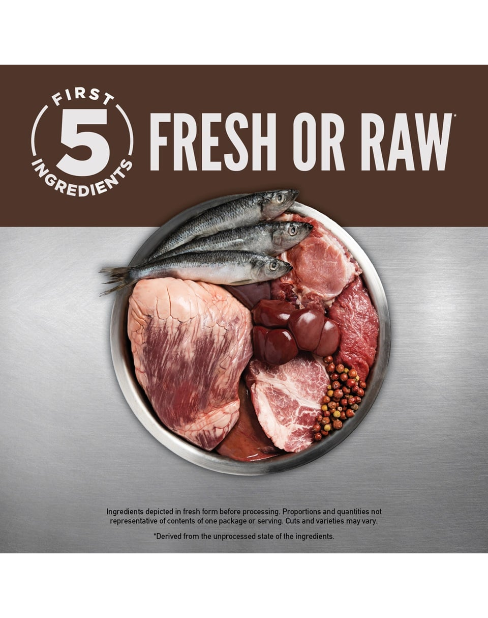 Carne crudă de vită (13%), sardine întregi crude (11%), bizon crud (5%), miel crud (5%), porc crud (5%), ficat crud de vită (5%), ficat crud de porc (5%), ouă proaspete (4%), miel deshidratat (4%), vită deshidratată (4%), hering deshidratat (4%), sardină deshidratată (4%), carne de oaie deshidratată (4%), carne de porc deshidratată (4%), ulei de rapiță, linte roșie întreagă, mazăre întreagă, năut întreg, linte verde întreagă, amidon de mazăre, ulei de pește alb (2%), ficat crud de miel (2%), pollack de Alaska uscat (2%), fasole pinto întreagă, fasole comună întreagă, fibre de linte, rinichi de vită crud (0,5%), pipotă de vită crudă (0,5%), rinichi de miel crud (0,5%), tripa de miel crudă (0,5%), alge marine uscate, dovleac proaspăt întreg, dovlecel proaspăt întreg, morcov proaspăt întreg, măr proaspăt întreg, pere întregi proaspete, rădăcină uscată de cicoare, varză proaspătă, spanac proaspăt, sfeclă roșie proaspătă, frunze proaspete de nap, merișoare întregi, afine întregi, mure întregi, turmeric, ciulin sfânt, rădăcină de brusture, lavandă, rădăcină de valeriană, măceșe.
