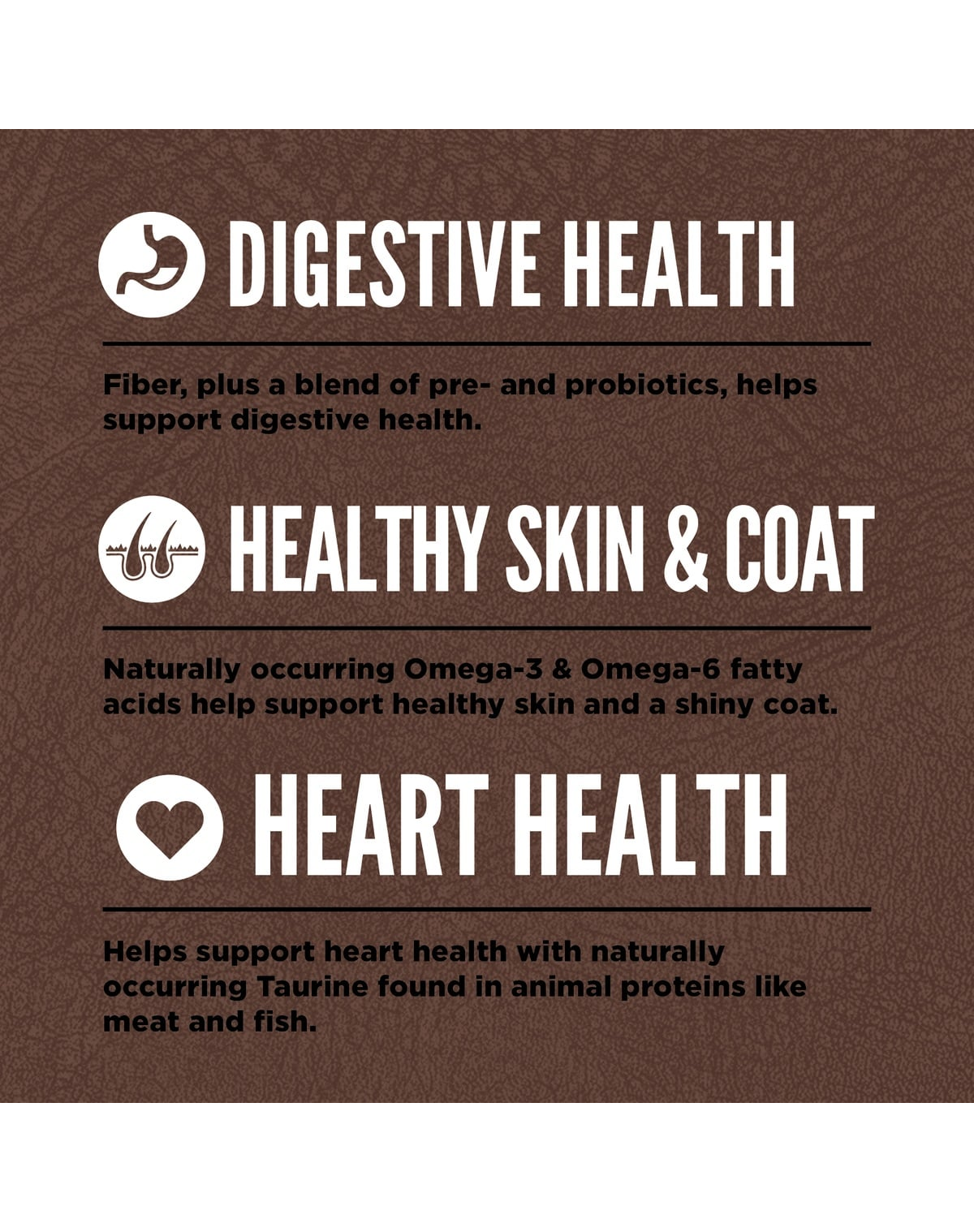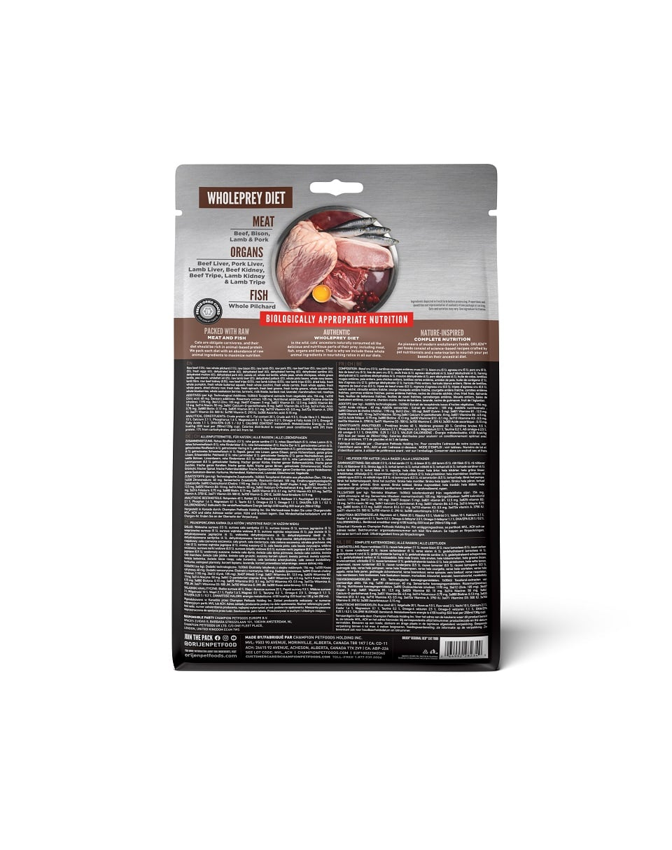 Hrană uscată, completă, fără cereale, pentru pisici adulte. Este plină de proteine nutritive din carne de vită, bizon, miel, carne de porc, sardine și, de asemenea, organe comestibile, și ouă de fermă. Ingredientele sunt livrate proaspete zilnic și adăugate în hrană în proporții nutritive. Formula conține un conținut limitat de grăsimi și carbohidrați și un amestec unic de fibre din dovleac și măr, asigurând o condiție maximă pentru toate pisicile adulte. Formularea hranei s-a bazat pe dieta ancestrală a pisicilor și pe ani de cercetare. Un conținut ridicat de proteine animale de 85% asigură aminoacizii și alți nutrienți cu cea mai bună și cea mai rapidă absorbție. 2/3 din ingrediente sunt potrivite pentru consumul uman și sunt doar ușor prelucrate în mâncare, în timp ce restul de 1/3 este deshidratat la 90*.
