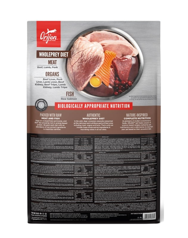 COMPOZIȚIE: carne crudă de vită (18,5%), carne crudă de miel (7%), carne crudă de porc (7%), ficat crud de vită (5%), somon crud (5%), ficat crud de porc (5%), ouă proaspete (5%), carne de miel deshidratată (5%), carne de vită deshidratată (5%), hering deshidratat (5%), linte roșie întreagă, fasole pinto întreagă, carne de porc deshidratată (3,5%), sardină deshidratată (3,5%), linte verde întreagă, năut întreg, fasole albă întreagă, fibre de linte, grăsime de vită (2%), ulei de pește alb (2%), ficat crud de miel (1,5%), rinichi de vită crud (1,5%), stomac de vită crud (1,5%), rinichi de miel crud (1%), stomac de miel crud (1%), alge uscate, dovleac proaspăt întreg, dovlecel proaspăt întreg, morcov proaspăt întreg, măr proaspăt întreg, pară proaspătă întreagă, rădăcină uscată de cicoare, varză proaspătă, spanac proaspăt, frunze proaspete de sfeclă roșie, frunze proaspete de napi, afine întregi, merișoare întregi, fructe de saskatoon întregi, turmeric, ciulin de lapte, rădăcină de brusture, lavandă, rădăcină de valeriană, măceșe.