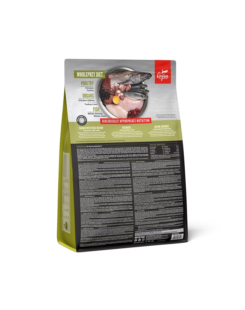 Pui proaspăt (18%), curcan crud (10%), măruntaie proaspete de pui (ficat, inimă) (10%), hering întreg crud (6%), merluciu întreg crud (5%), ouă proaspete (5%), ficat crud de curcan (5%), pui deshidratat (5%), curcan deshidratat (5%), macrou deshidratat (4%), sardine deshidratate (4%), hering deshidratat (4%), linte roșie întreagă, linte verde întreagă, mazăre întreagă, fibre de linte, năut întreg, fasole pinto întreagă, amidon de mazăre, ulei de pollock (2%), grăsime de pui (2%), fasole navy întreagă, alge marine uscate, dovleac întreg proaspăt, musacal întreg proaspăt, dovlecel întreg proaspăt, dovleac întreg proaspăt, morcovi întregi proaspeți, mere întregi proaspete, pere întregi proaspete, rădăcină de cicoare uscată, varză kale proaspătă, spanac proaspăt, sfeclă roșie proaspătă, frunze de napi proaspete, afine întregi, afine întregi, fructe de saskatoon întregi, turmeric, ciulin de lapte, rădăcină de brusture, lavandă, holly, măceșe.