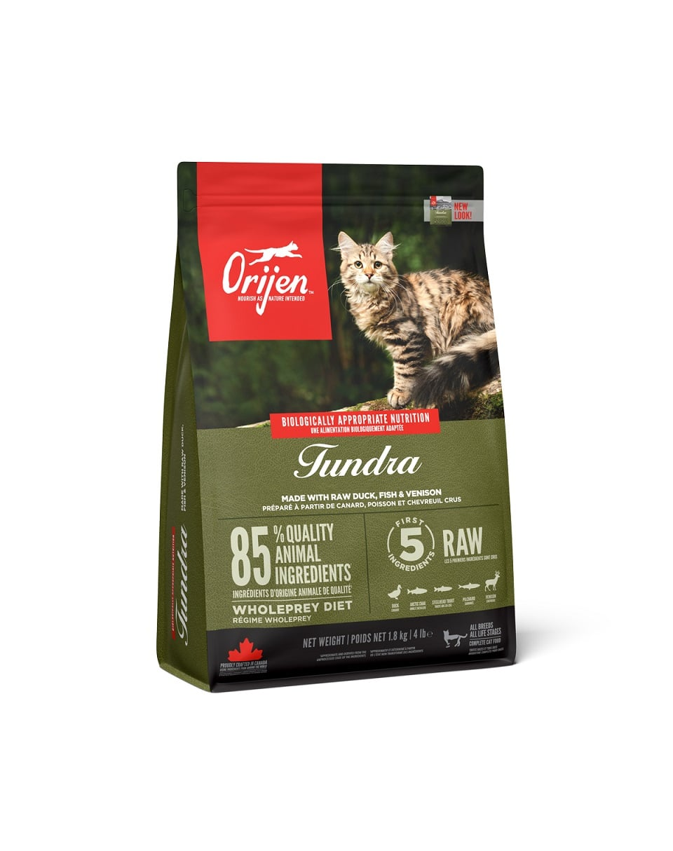 Orijen Tundra Cat este o hrană formată din până la 8 ingrediente principale selectate și proaspete. Carne proaspătă de capră, carne de vânat, carne de oaie, rață, prepeliță, păstrăv, wapiti crescut în aer liber și organe comestibile. Principalele produse sunt regionale - provenite exclusiv de la ferme locale de încredere, fără adaosuri de conservanți și antibiotice. În plus, hrana conține multe legume și fructe - dovleac, dovlecei, morcovi, mere și pere. Trandafirii adaugă aromă. Nevoile biologice ale evoluției sunt clare, iar cerința optimă este de 40% proteine și 18% carbohidrați, ceea ce oferă Orijen Tundra.