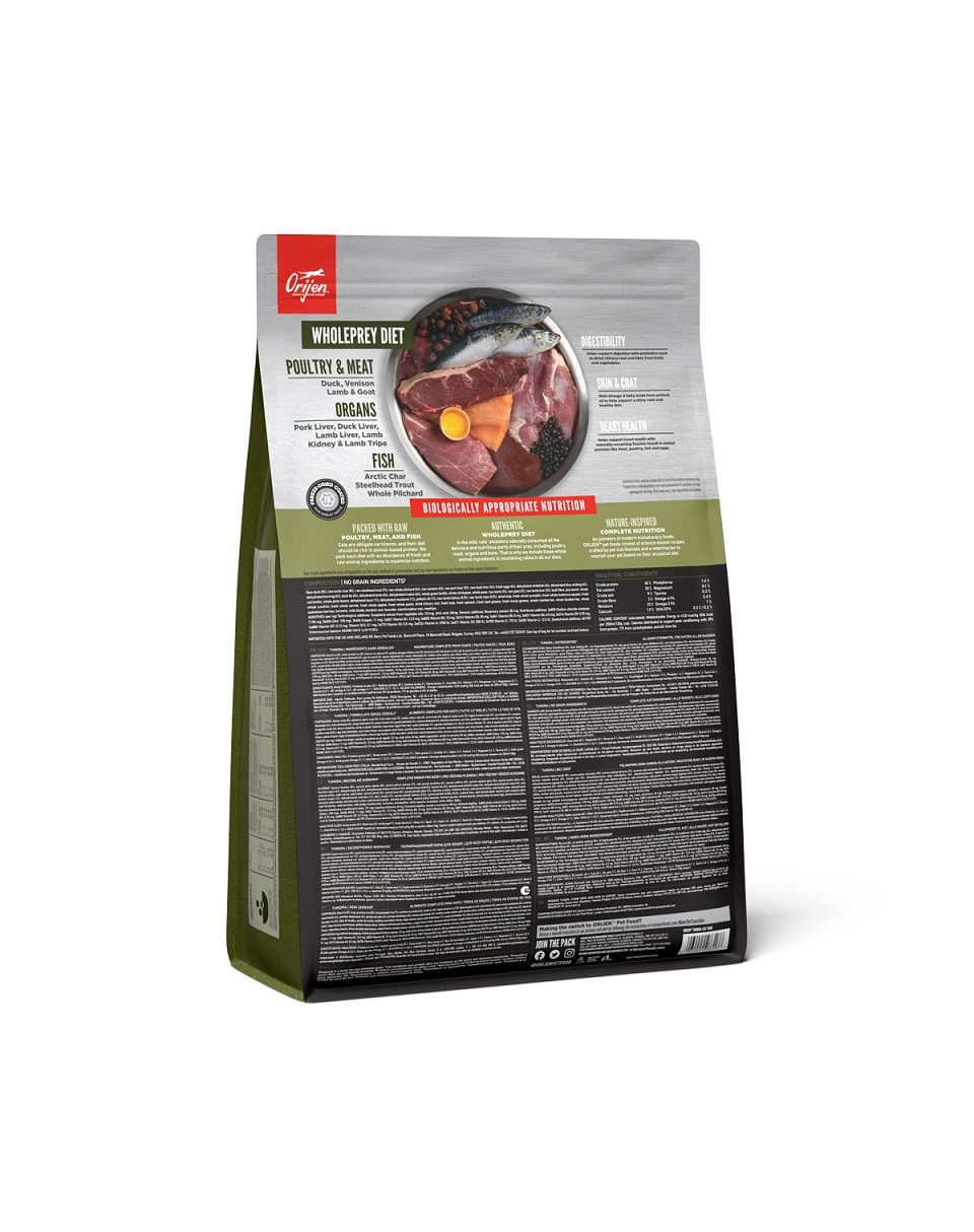 Rață crudă (8%), păstrăv crud (8%), păstrăv steelhead crud (7%), sardină crudă (6%), carne de vânat crudă (6%), ficat de porc crud (5%), ficat de rață crud (4%), ouă proaspete (4%), pește alb deshidratat (4%), merlan albastru deshidratat (4%), hering deshidratat (4%), grăsime de rață (4%), miel deshidratat (4%), carne de oaie deshidratată (4%), linte verde întreagă, năut întreg, mazăre întreagă, mazăre întreagă, miel crud (3%), capră crudă (3%), ficat de miel crud (3%), fibre de linte, amidon de mazăre, linte roșie întreagă, fasole pinto întreagă, rață deshidratată (1%), macrou deshidratat (1%), ulei de pollock (1%), rinichi de miel crud (0. 5%), măruntaie crudă de miel (0,5%), alge marine uscate, dovleac întreg proaspăt, dovleac muscat întreg proaspăt, dovleac întreg proaspăt, dovlecel întreg proaspăt, morcov întreg proaspăt, măr întreg proaspăt, pară întreagă proaspătă, rădăcină de cicoare uscată, varză kale proaspătă, spanac proaspăt, sfeclă roșie proaspătă, frunze de napi proaspete, afine întregi, afine întregi, fructe de saskatoon întregi, turmeric, ciulin de lapte, rădăcină de brusture, lavandă, holly, măceșe.