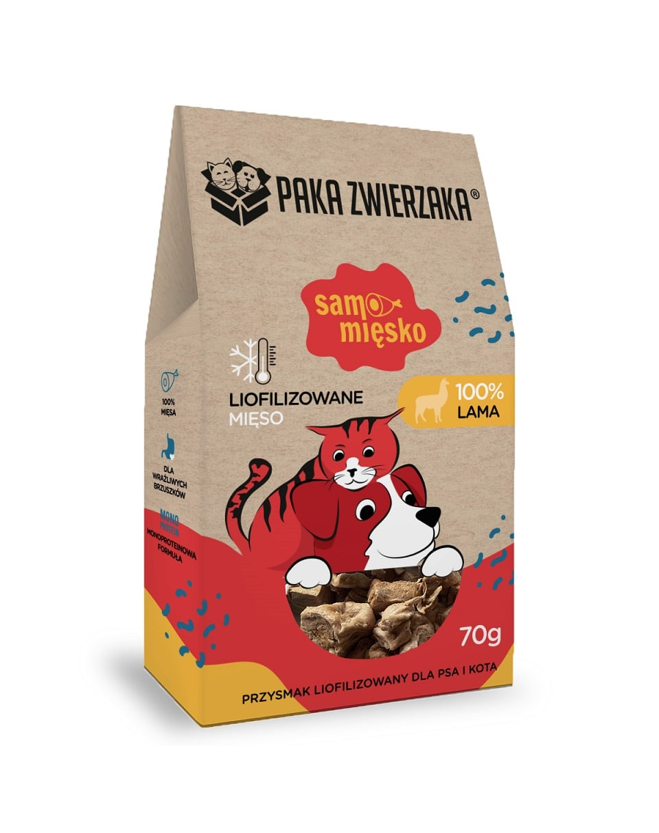 O gustare naturală, de înaltă calitate, destinată câinilor și pisicilor, realizată exclusiv din carne de lamă. Nu conține cereale, conservanți, aditivi artificiali sau umpluturi. Prin procesul de liofilizare (uscare prin îngheț), produsul își păstrează complet valoarea nutritivă, gustul și aroma naturală – calități apreciate chiar și de cei mai mofturoși blănoși.