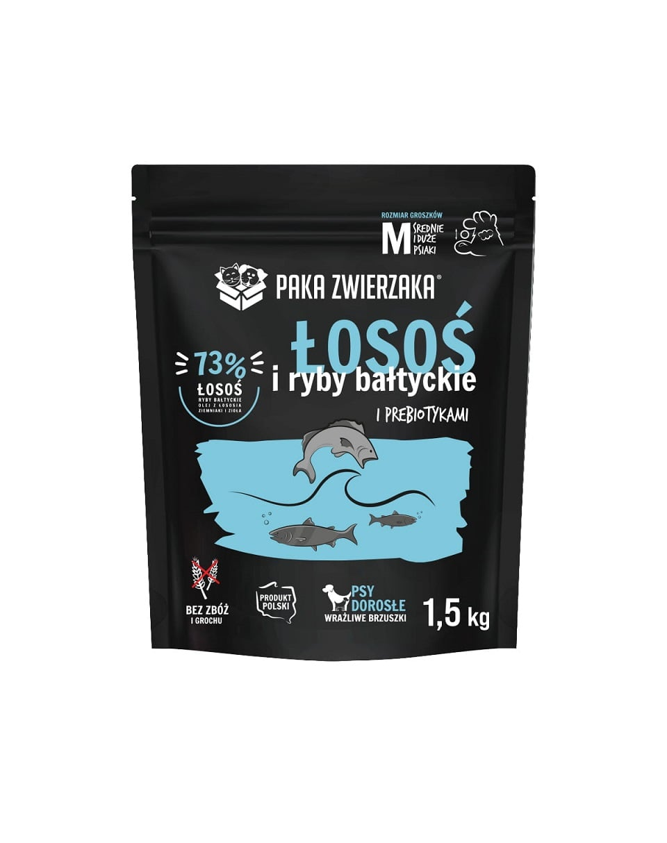 Hrană uscată de calitate SUPERPREMIUM perfect echilibrată, fără cereale, mazăre, porumb, soia, conservanți și coloranți artificiali. Carnea de somon de calitate superioară, peștele baltic, legumele și ierburile obținute de la furnizori locali vor asigura o palatabilitate ridicată și o digestibilitate ușoară. O formulă ideală pentru câinii cu stomacul delicat și intoleranță la cereale.