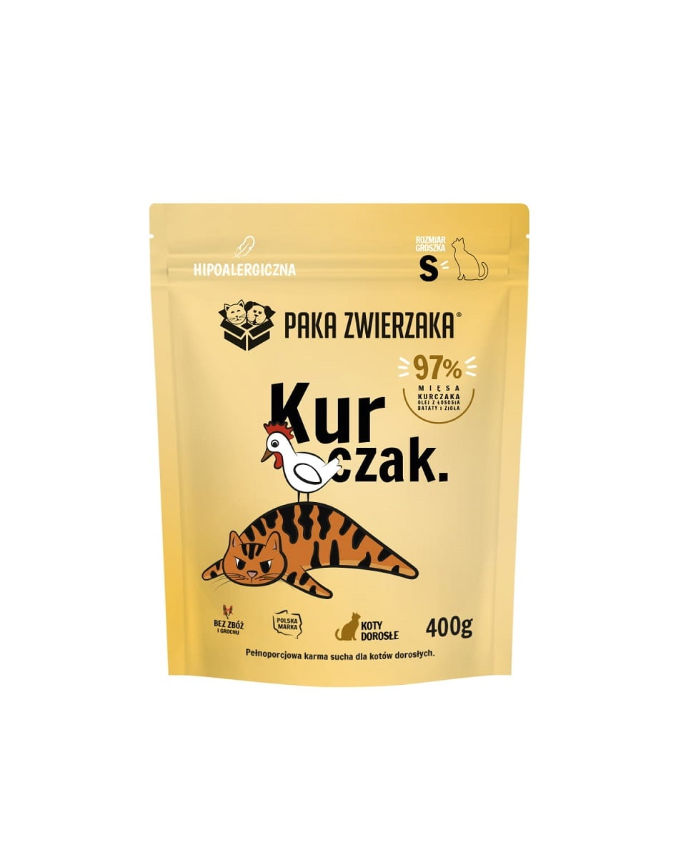 Paka Zwierzaka Pui este o hrană uscată completă, echilibrată, de clasă Superpremium, creată pentru pisici adulte din toate rasele, inclusiv pentru cele sterilizate. Granulele de dimensiune S sunt adaptate pentru hrănirea zilnică.
