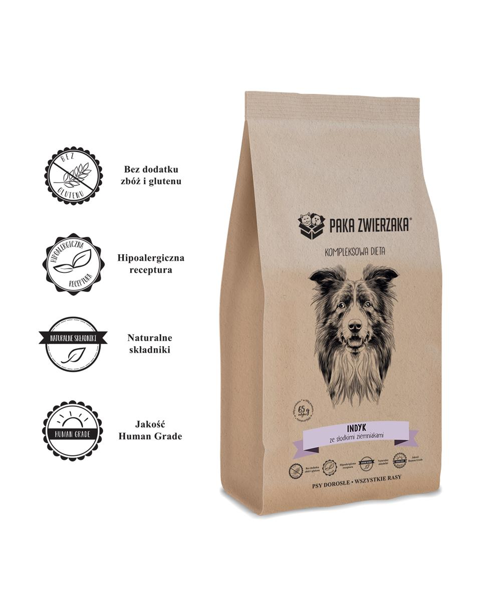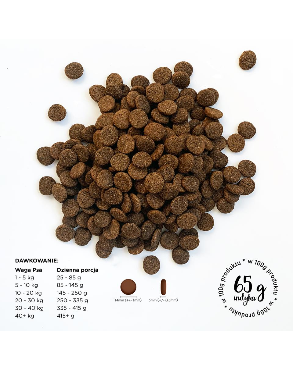 Hrana uscată este fabricată din ingrediente de înaltă calitate. Conținutul de carne de curcan este de 65 g la 100 g de produs. Hrana oferă câinilor toate vitaminele și oligoelementele necesare pentru dezvoltarea corectă a organismului. Utilizarea unei singure surse de proteine reduce riscul de alergii și intoleranță alimentară.