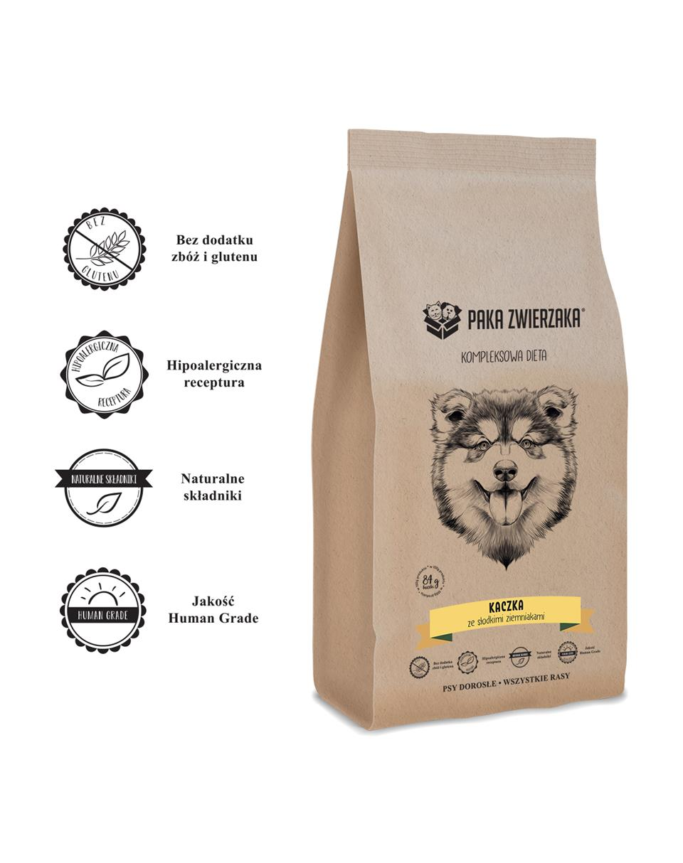 Hrana uscată este fabricată din ingrediente de înaltă calitate. Conținutul de carne de rață este de 84 g la 100 g de produs. Hrana oferă câinilor toate vitaminele și oligoelementele necesare pentru dezvoltarea corectă a organismului. Utilizarea unei singure surse de proteine reduce riscul de alergii și intoleranță alimentară.