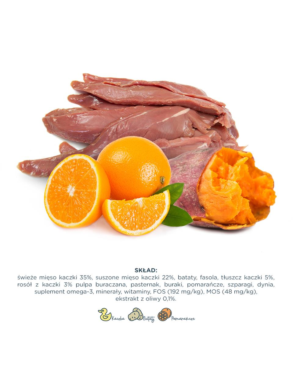 Rață 65% (inclusiv carne de rață proaspăt preparată 35%, carne de rață uscată 22%, grăsime de rață 5% și bulion de rață 3%), igname, mazăre, pulpă de sfeclă, păstârnac, sfeclă roșie, portocale, sparanghel, dovleac, supliment omega-3, minerale, vitamine, FOS (192 mg/kg), MOS (48 mg/kg), extract de ulei de măsline 0,1%.