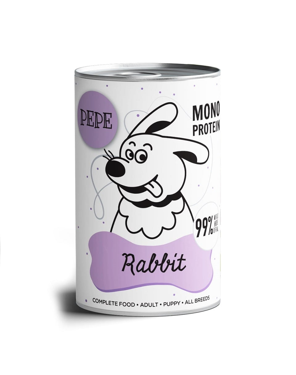 PAKA ZWIERZAKA PEPE Rabbit este o hrană umedă completă, naturală și monoproteică, preparată exclusiv din carne de iepure. Formula simplă și curată, cu 99% carne, organe și supă de iepure, face ca această rețetă să fie ideală pentru câinii de toate vârstele, inclusiv pentru căței și câinii sensibili sau alergici.