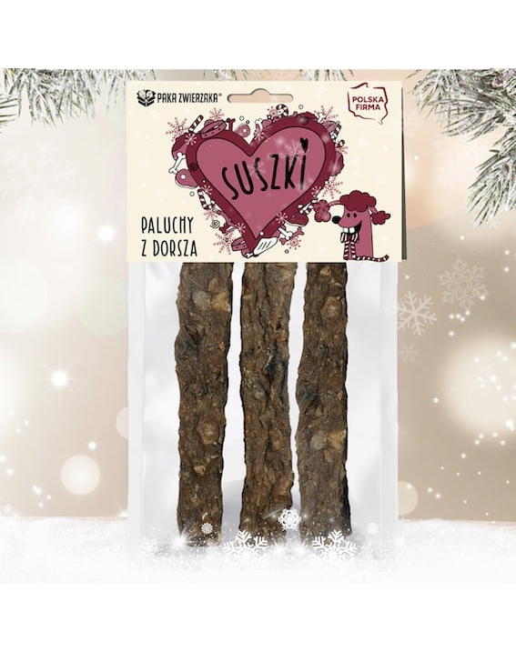 PAKA ZWIERZAKA sunt o gustare naturală și aromată, creată special pentru câinii de toate vârstele, inclusiv pentru pui. Rețeta se bazează exclusiv pe pește – cod și somon – ceea ce oferă un aport valoros de proteine ușor digerabile, vitamine și acizi grași omega-3 cu rol esențial în menținerea sănătății pielii, a sistemului imunitar și a funcțiilor cognitive.