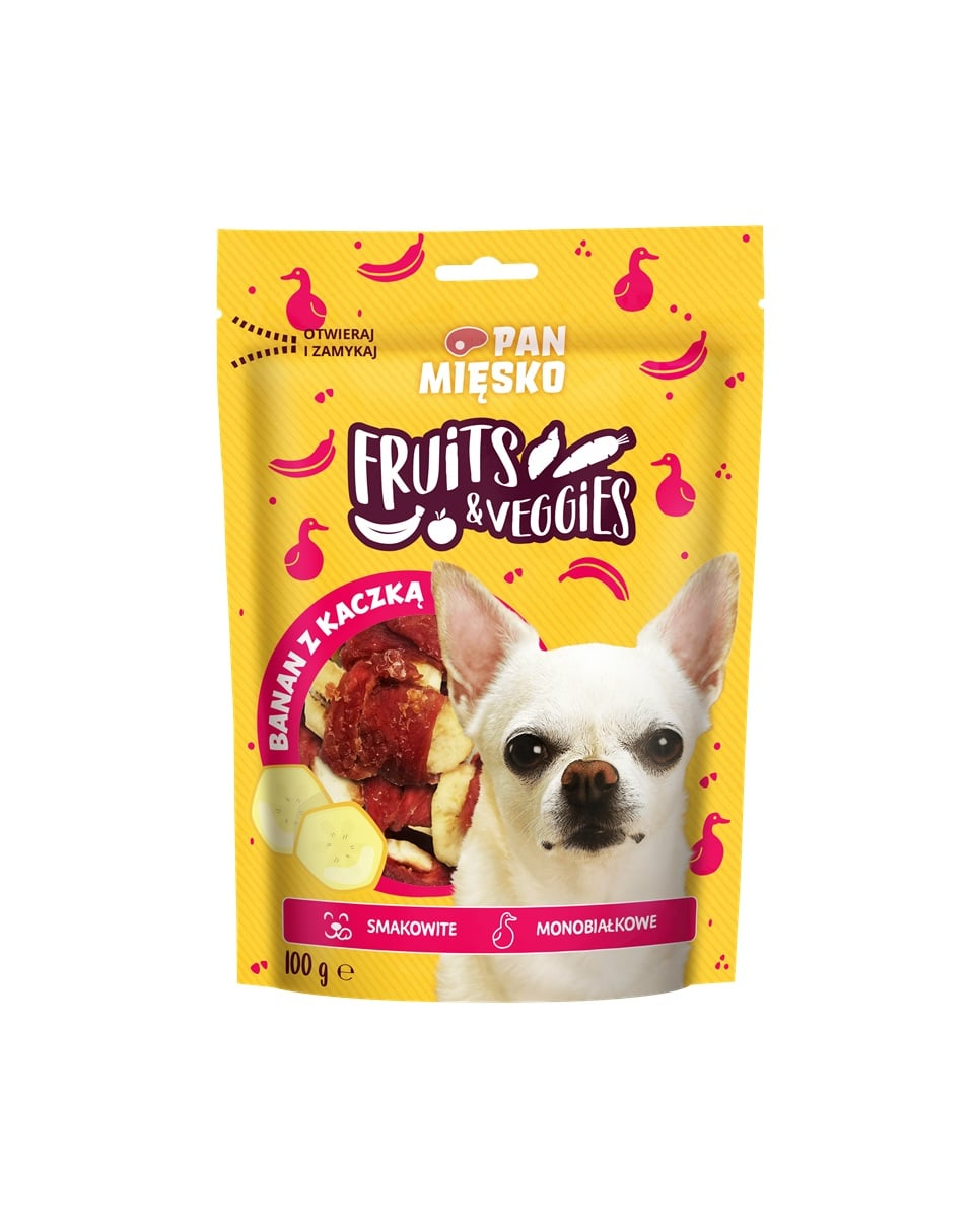 Dacă câinele tău iubește combinațiile inedite de gusturi, cu siguranță va adora gustările aromate Pan Mięsko FRUITS & VEGGIES! Fructele și legumele învelite în bucăți suculente de carne reprezintă o adevărată delicatesă pentru papilele gustative. Aceste gustări sunt ideale ca recompensă în timpul antrenamentului sau ca o gustare între mese pentru patrupedul tău.