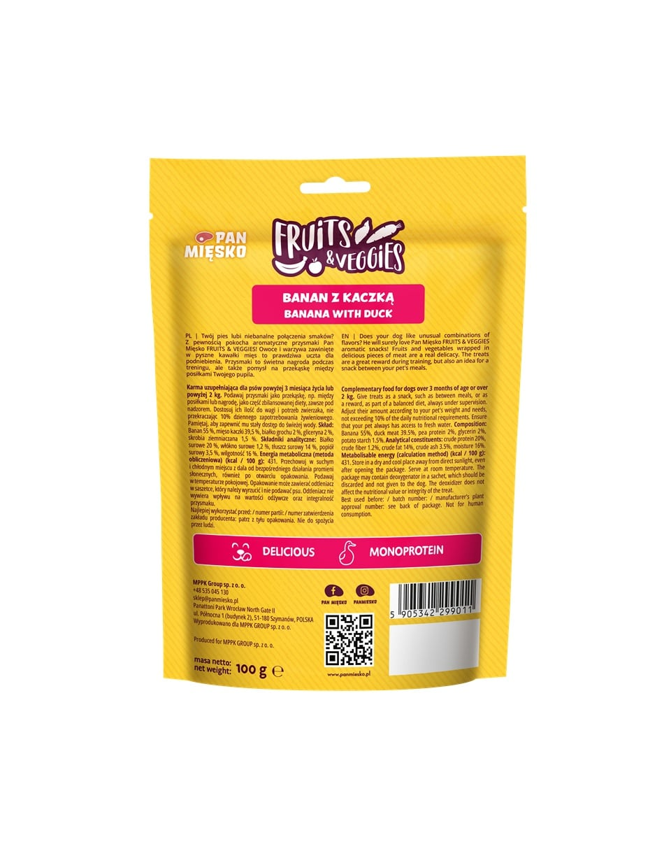 Compoziție: Banane 55 %, Carne de rață 39,5 %, Proteine din mazăre 2 %, Amidon din cartofi 1,5 %, Glicerină 2 %