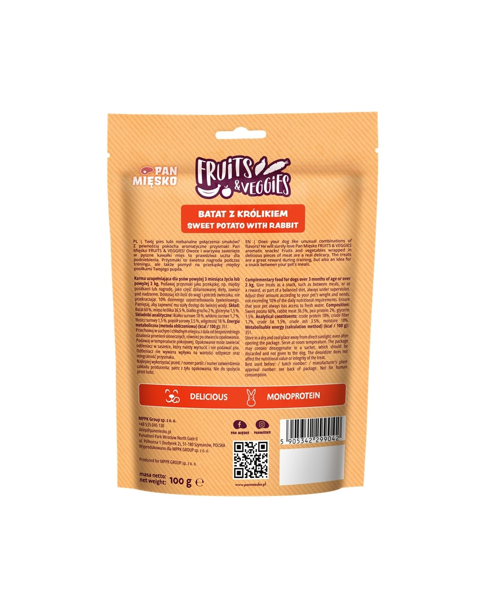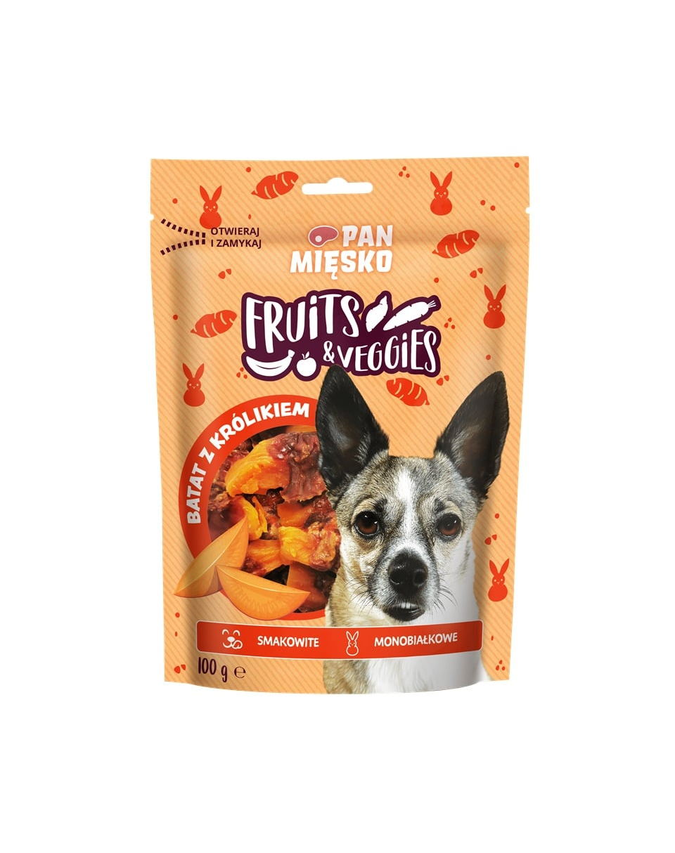 PAN MIĘSKO Fruits and Veggies Deliciu pentru câini cu cartof dulce și carne de iepure, 100 g