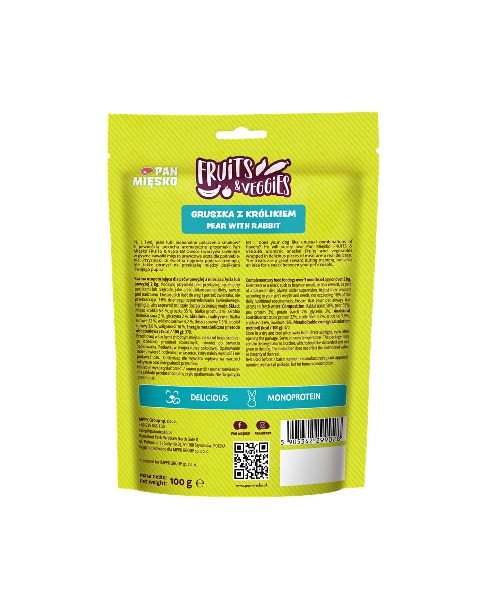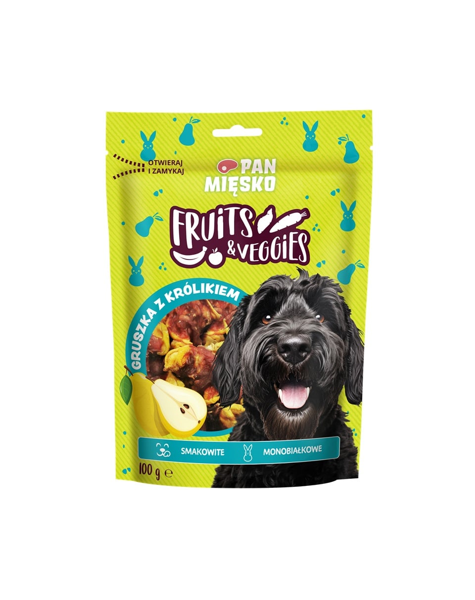 Dacă câinele tău iubește combinațiile inedite de gusturi, cu siguranță va adora gustările aromate Pan Mięsko FRUITS & VEGGIES! Fructele și legumele învelite în bucăți suculente de carne reprezintă o adevărată delicatesă pentru papilele gustative. Aceste gustări sunt ideale ca recompensă în timpul antrenamentului sau ca o gustare între mese pentru patrupedul tău.