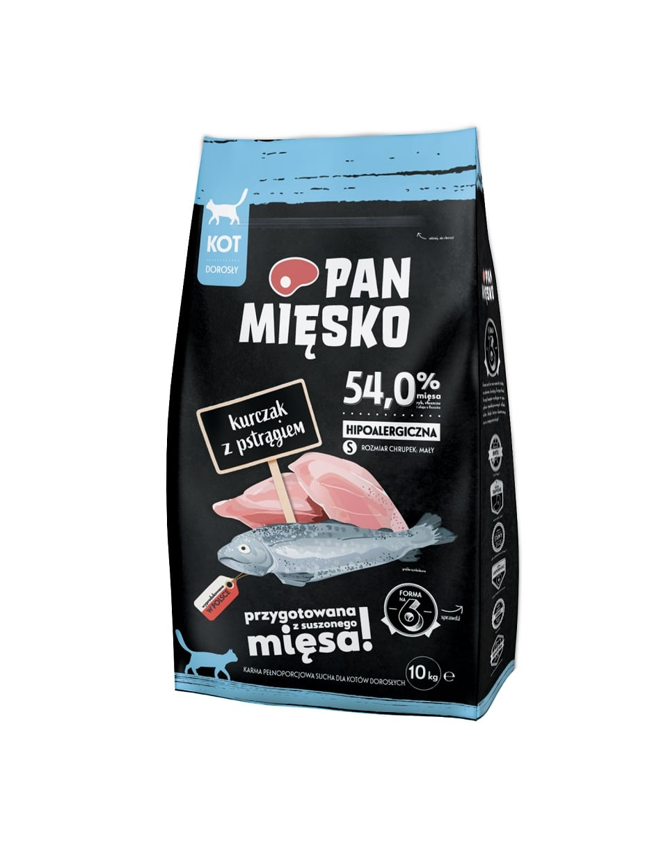 Faceți cunoștință cu hrana uscată hipoalergenică pentru pisici Pan Mięsko. Acestea se disting prin cărnurile atent selecționate cu mere poloneze suculente, legume sănătoase și nutrienți valoroși care vor influența pozitiv sănătatea și starea de sănătate a pisicii dumneavoastră. Rețetele noastre au fost pregătite de specialiști pentru a-i oferi companionului dumneavoastră patruped exact ceea ce are nevoie. Pisica dvs. merită ce e mai bun.