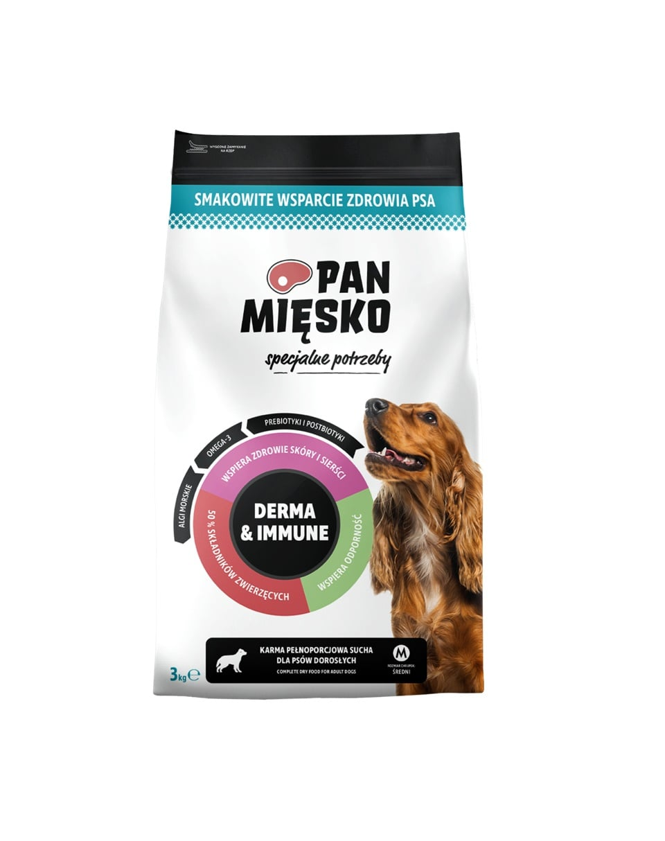 Derma & Immune pentru câini adulți este o hrană destinată câinilor care au nevoie de susținerea sistemului imunitar și sunt predispuși la intoleranțe alimentare. Îmbogățită cu prebiotice și postbiotice benefice. Datorită adaosului de ulei de somon și alge marine, formula susține și menținerea unei blăni sănătoase și frumoase.