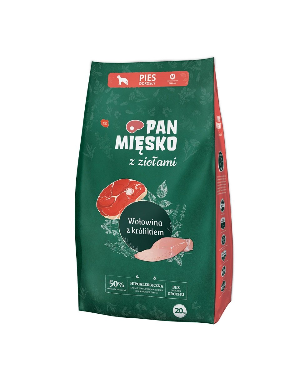 Pan Mięsko with Herbs se adresează animalelor de companie și stăpânilor acestora care caută o hrană preparată din ingrediente atent selecționate. Adăugarea unei compoziții de ierburi creează o porție aromată de gust și sănătate pentru câinele dumneavoastră.