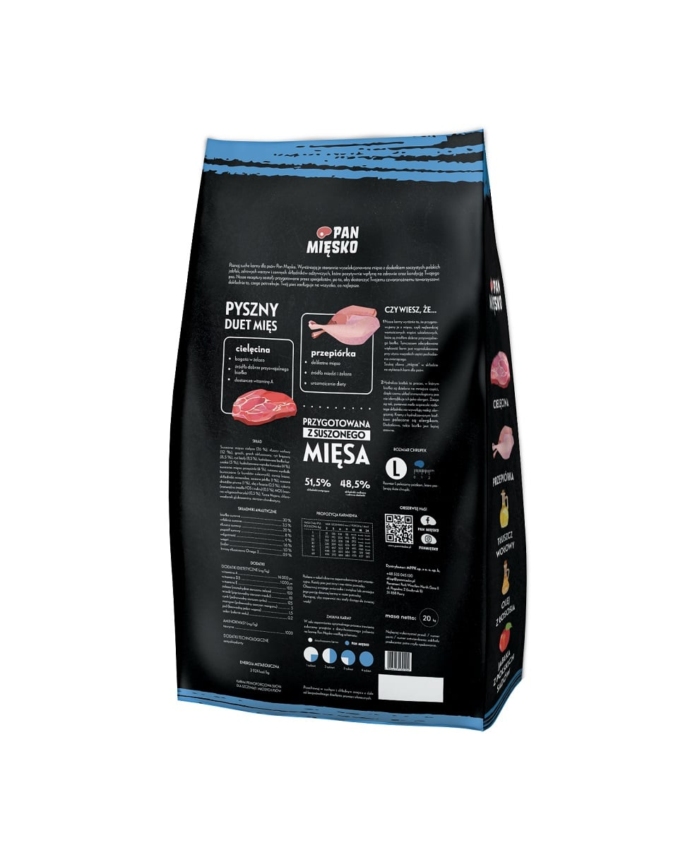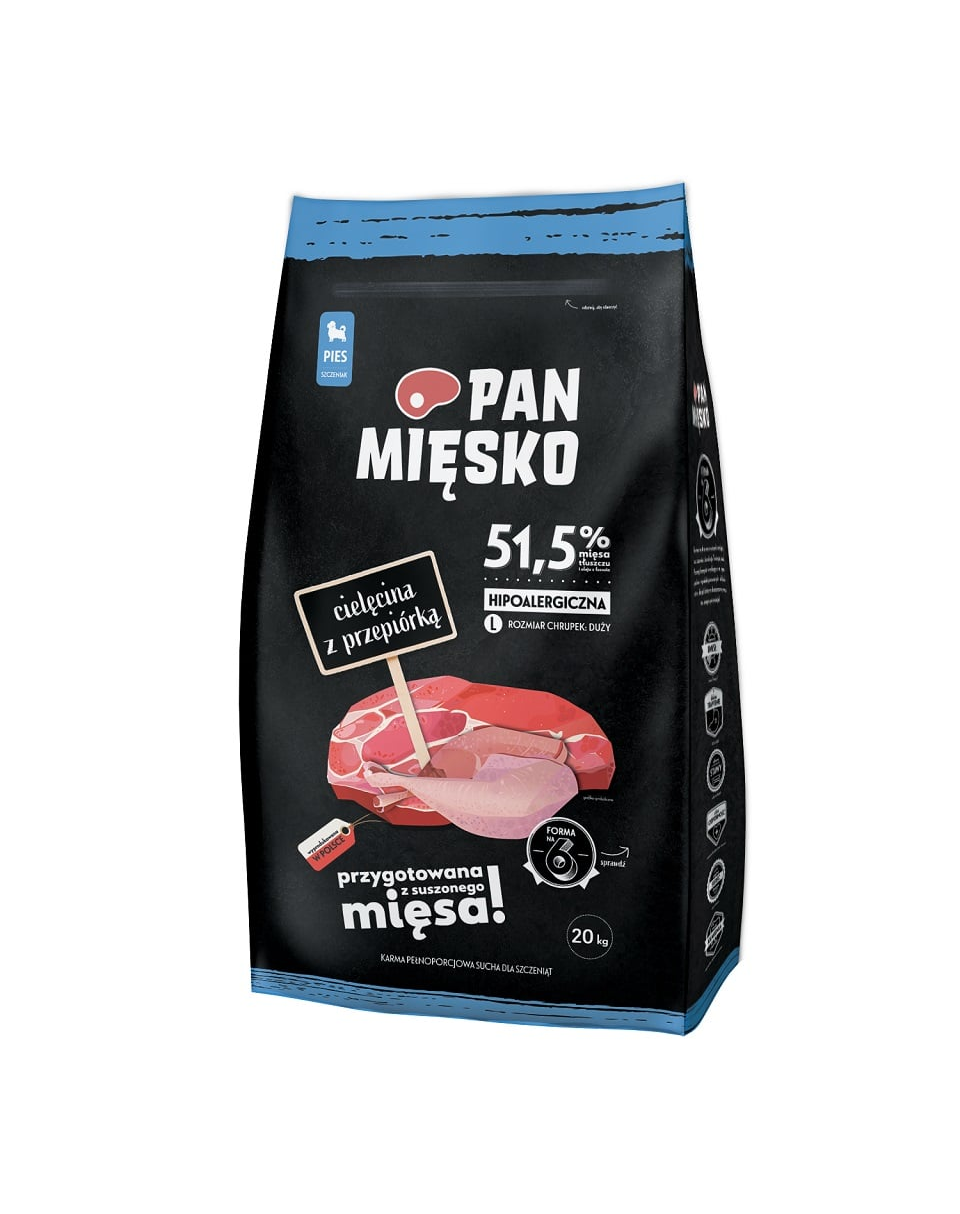 Descoperă hrana uscată pentru câini Pan Mięsko. Se remarcă prin ingrediente atent selectate, îmbogățite cu mere suculente din Polonia, legume sănătoase și nutrienți valoroși, care contribuie la sănătatea și buna condiție a câinelui tău. Rețetele noastre au fost create de specialiști pentru a oferi companionului tău patruped exact ceea ce are nevoie. Câinele tău merită tot ce este mai bun.